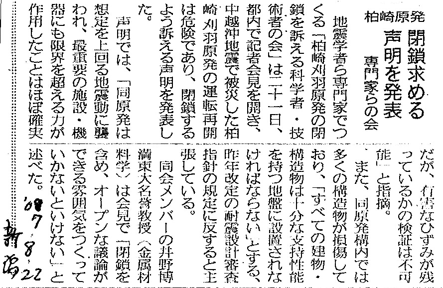 | [2007_08_22_02]柏崎原発 閉鎖求める声明を発表 専門家らの会(新潟日報2007年8月22日) |