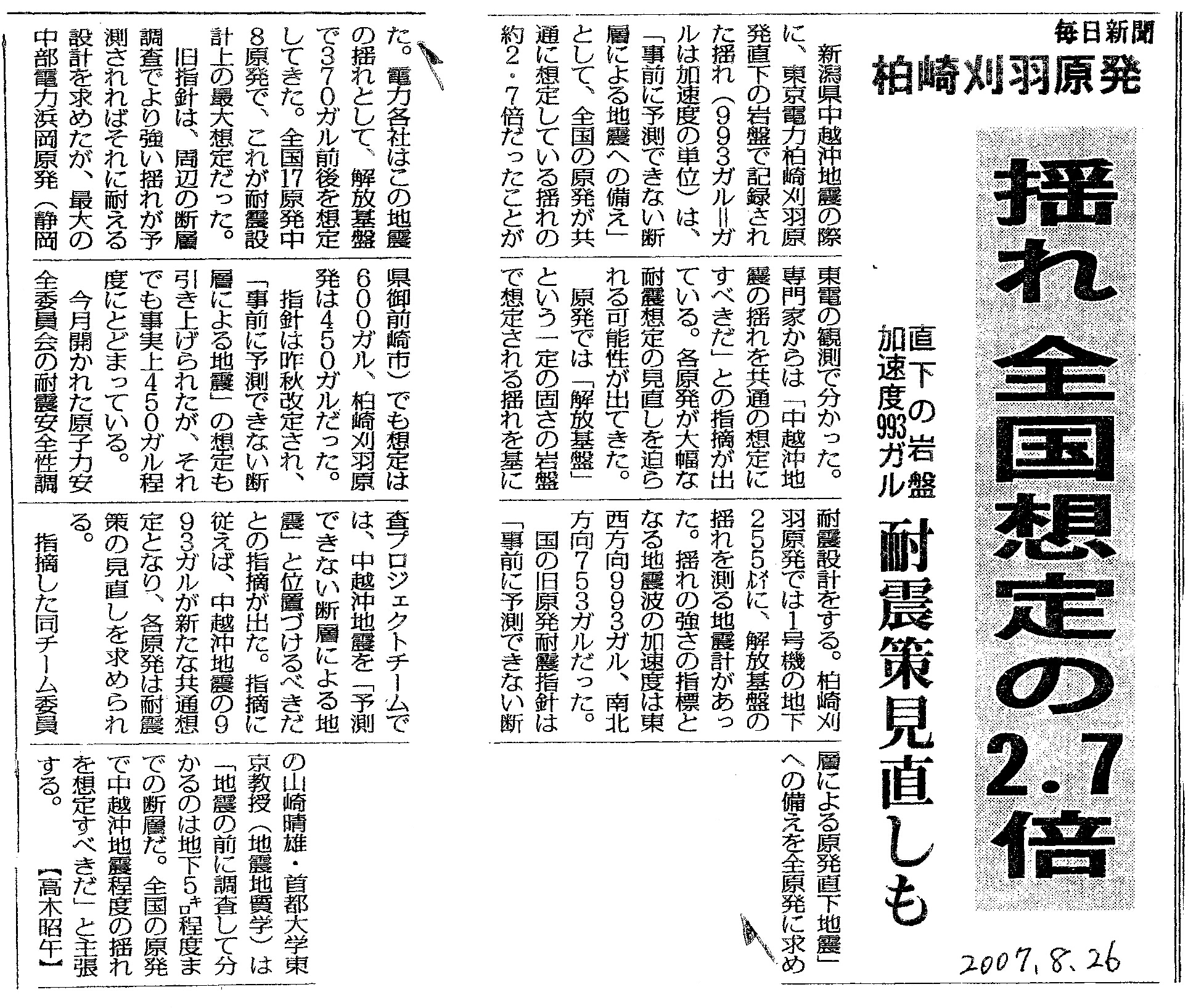 | [2007_08_26_01]柏崎刈羽原発 揺れ 全国想定の2.7倍 直下の岩盤 加速度993ガル 耐震策見直しも(毎日新聞2007年8月26日) |