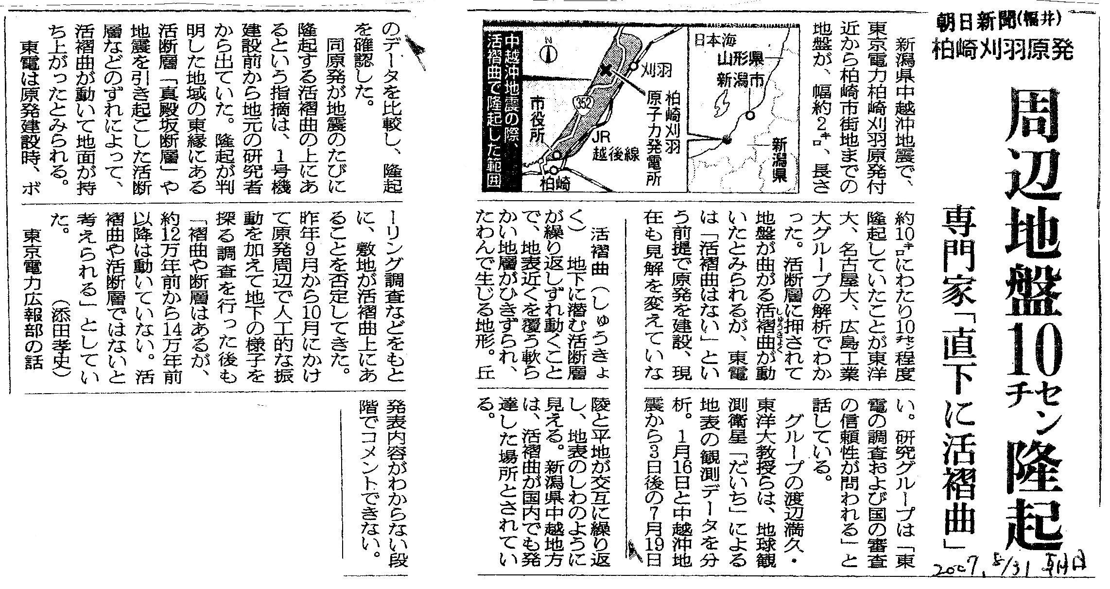 | [2007_08_31_01]柏崎刈羽原発 周辺地盤10センチ隆起 専門家「直下に活褶曲」(朝日新聞2007年8月31日) |