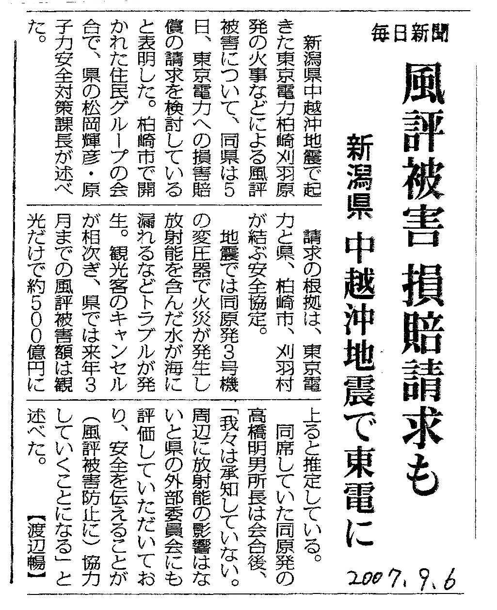 [2007_09_06_01]風評被害 損害請求も 新潟県 中越沖地震で東電に(毎日新聞2007年9月6日)