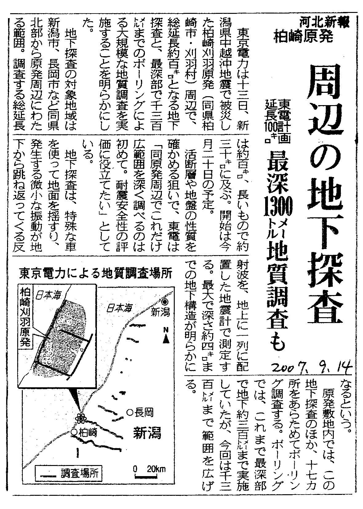 | [2007_09_14_01]柏崎原発 周辺の地下探査 東電計画延長100キロ 最深1300メートル地質調査も(河北新報2007年9月14日) |