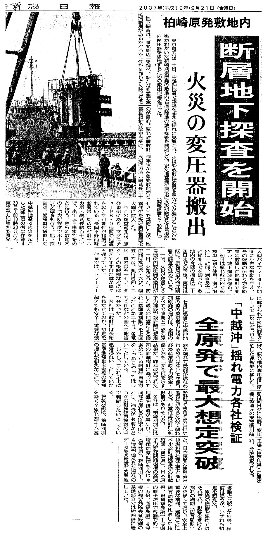 | [2007_09_21_01]柏崎原発敷地内 断層地下探査を開始 火災の変圧器搬出 「中越沖」揺れ電力会社検証 全原発で最大想定突破(新潟日報2007年9月21日) |