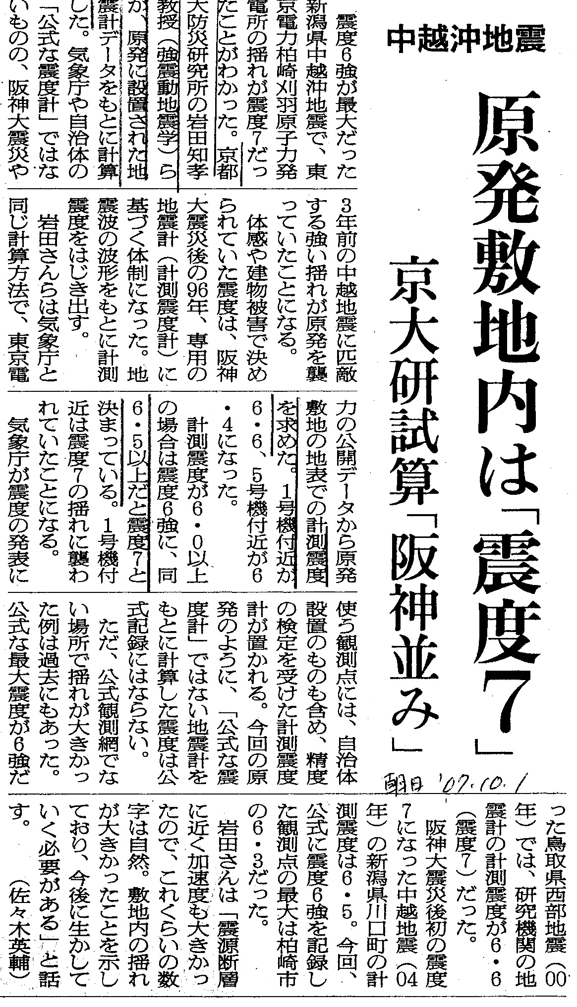 ※以下は上記本文中から重要と思われるヶ所を抜粋し、テキスト化したものである 震度6強が最大だった新潟県中越沖地震で、東京電力柏崎刈羽原子力発電所の揺れが震度7だったことがわかった。京都大防災研究所の岩田知孝教授(強振動地震学)らが、原発に設定された地震計データをもとに計算した。気象庁や自治体の「公式な震度計」ではないものの、阪神大震災や3年前の中越地震に匹敵する強い揺れが原発を襲っていることになる。 1号機が付近が6.6、5号機付近が6.4になった。 計測震度が6.5以上だと震度7と決まっている。 公式な最大震度が6強だった鳥取県西部地震(00年)では、研究機関の地震計の計測震度が6.6(震度7)だった。 |