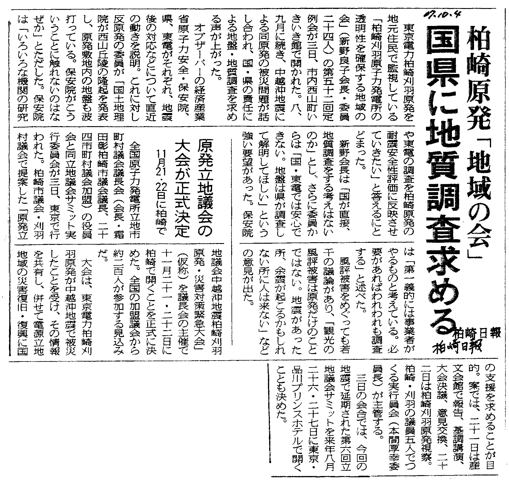 [2007_10_04_01]柏崎原発「地域の会」 国県に地質調査求める 原発立地議会の大会が正式決定 11月21・22日に柏崎で(柏崎日報2007年10月4日)