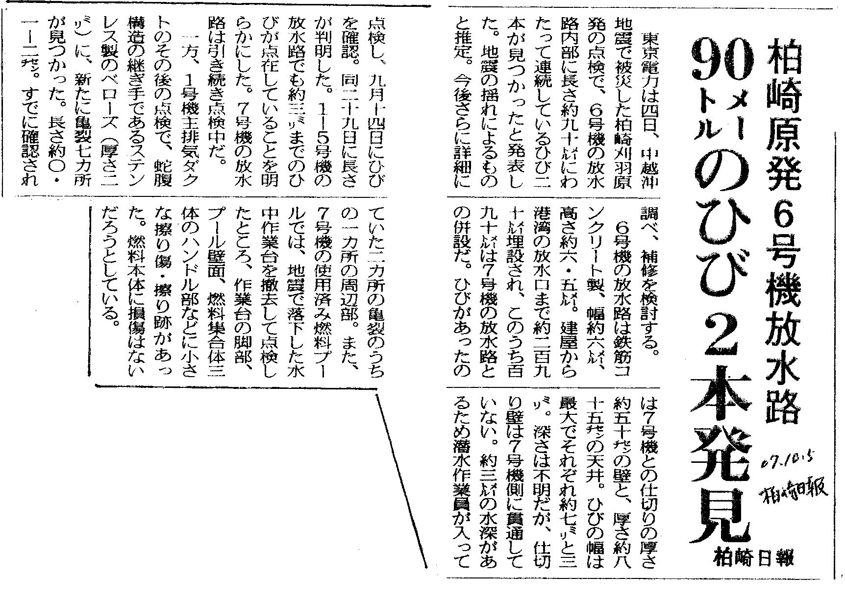 [2007_10_05_01]柏崎原発 6号機放水路 90メートルのひび2本発見(柏崎日報2007年10月5日)