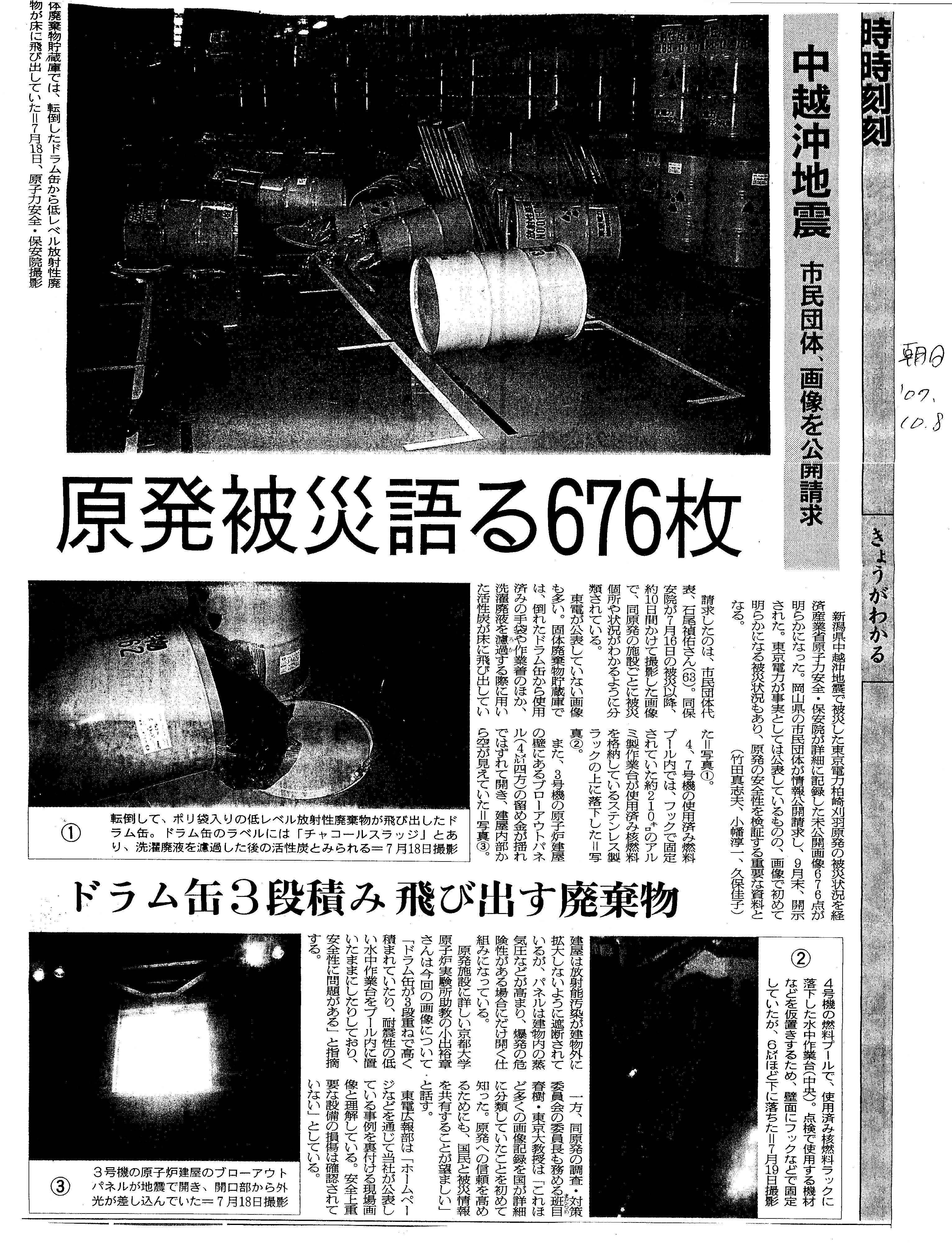 [2007_10_08_01]時々刻々 中越沖地震 市民団体、画像を公開請求 原発被災語る676枚 ドラム缶3段積み飛び出す廃棄物(朝日新聞2007年10月8日)