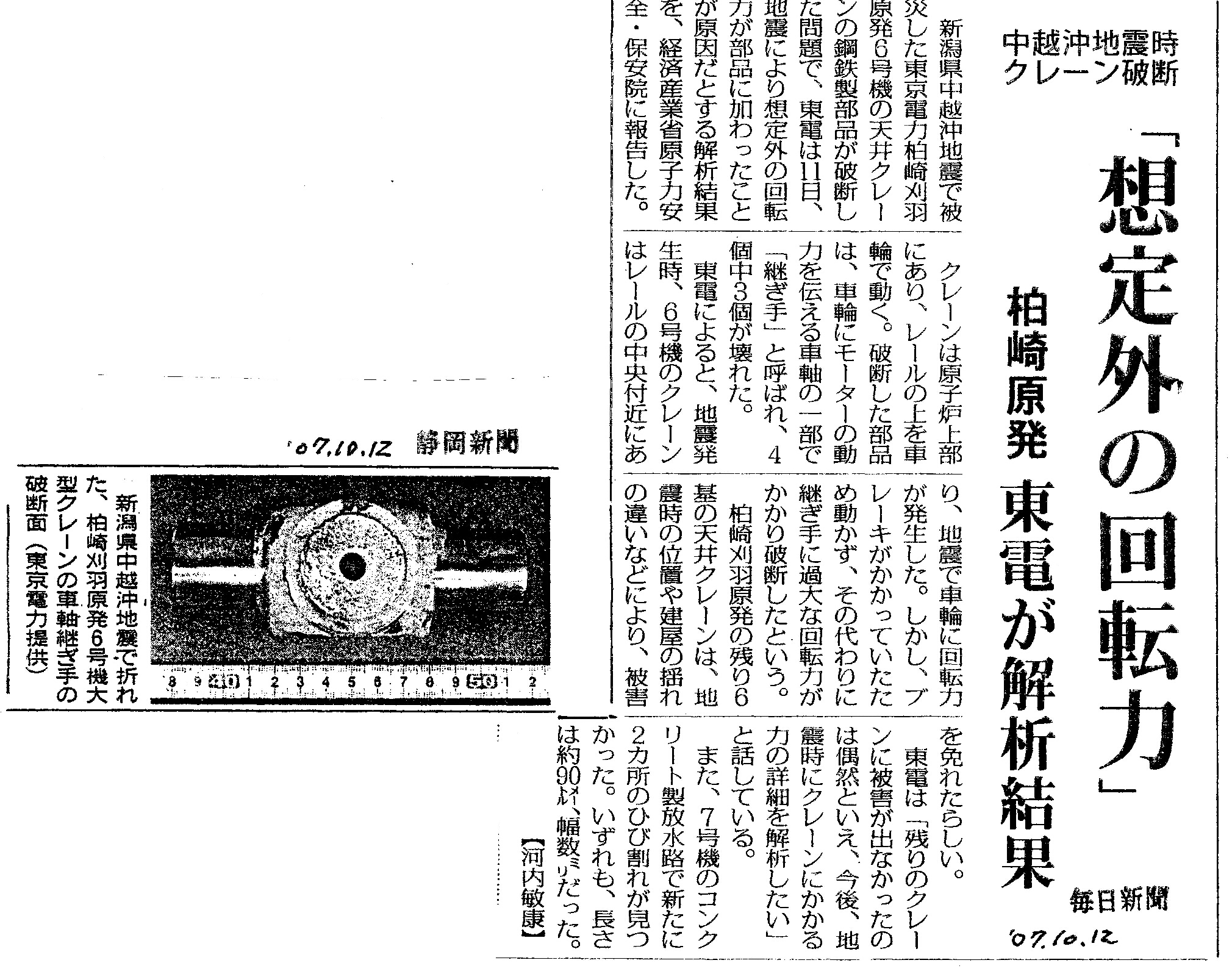[2007_10_12_02]中越沖地震時クレーン破断 「想定外の回転力」柏崎原発 東電が解析結果(毎日新聞2007年10月12日)