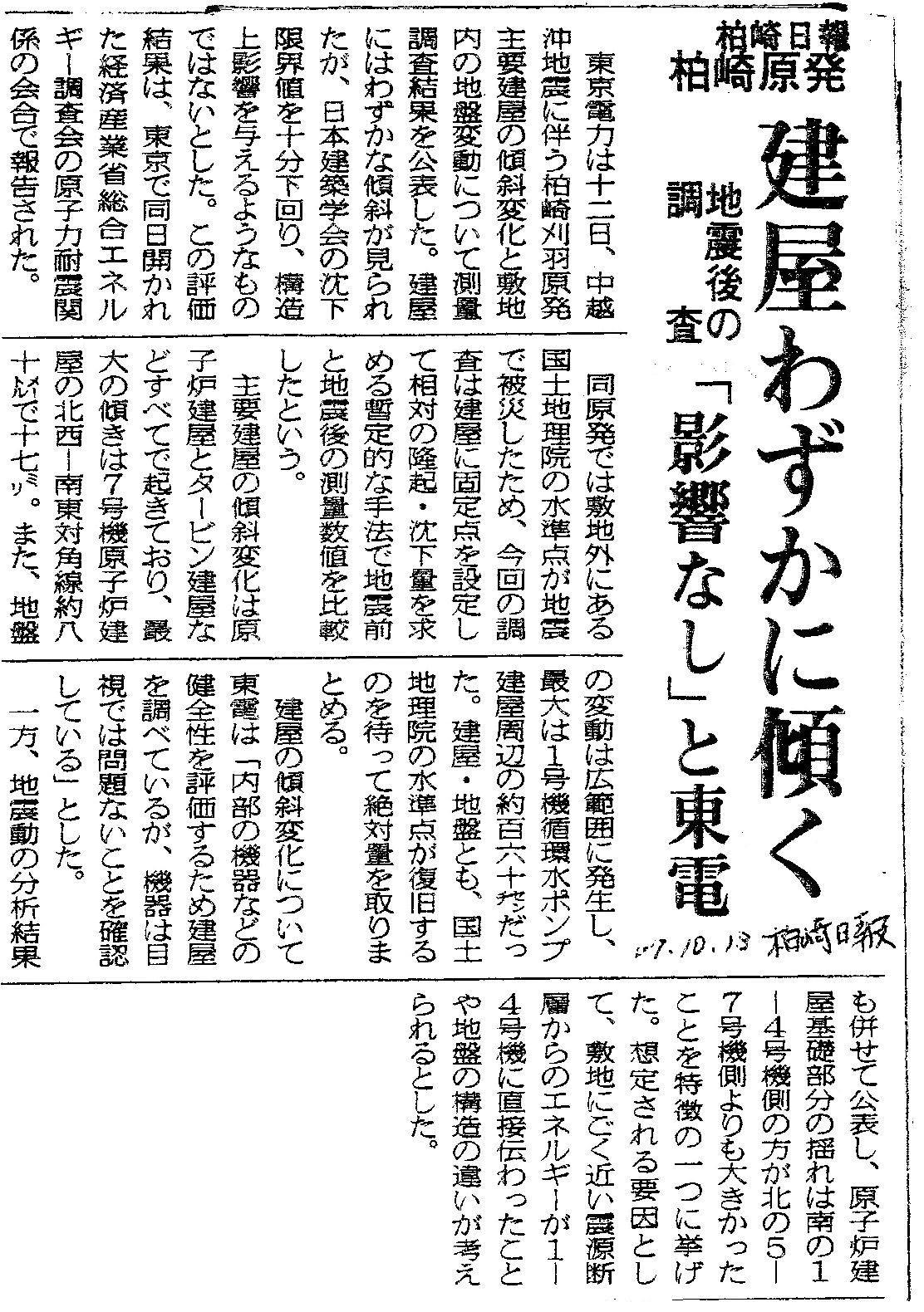 | [2007_10_13_01]柏崎原発 建屋わずかに傾く 地震後の調査 「影響なし」と東電(新潟日報2007年10月13日) |