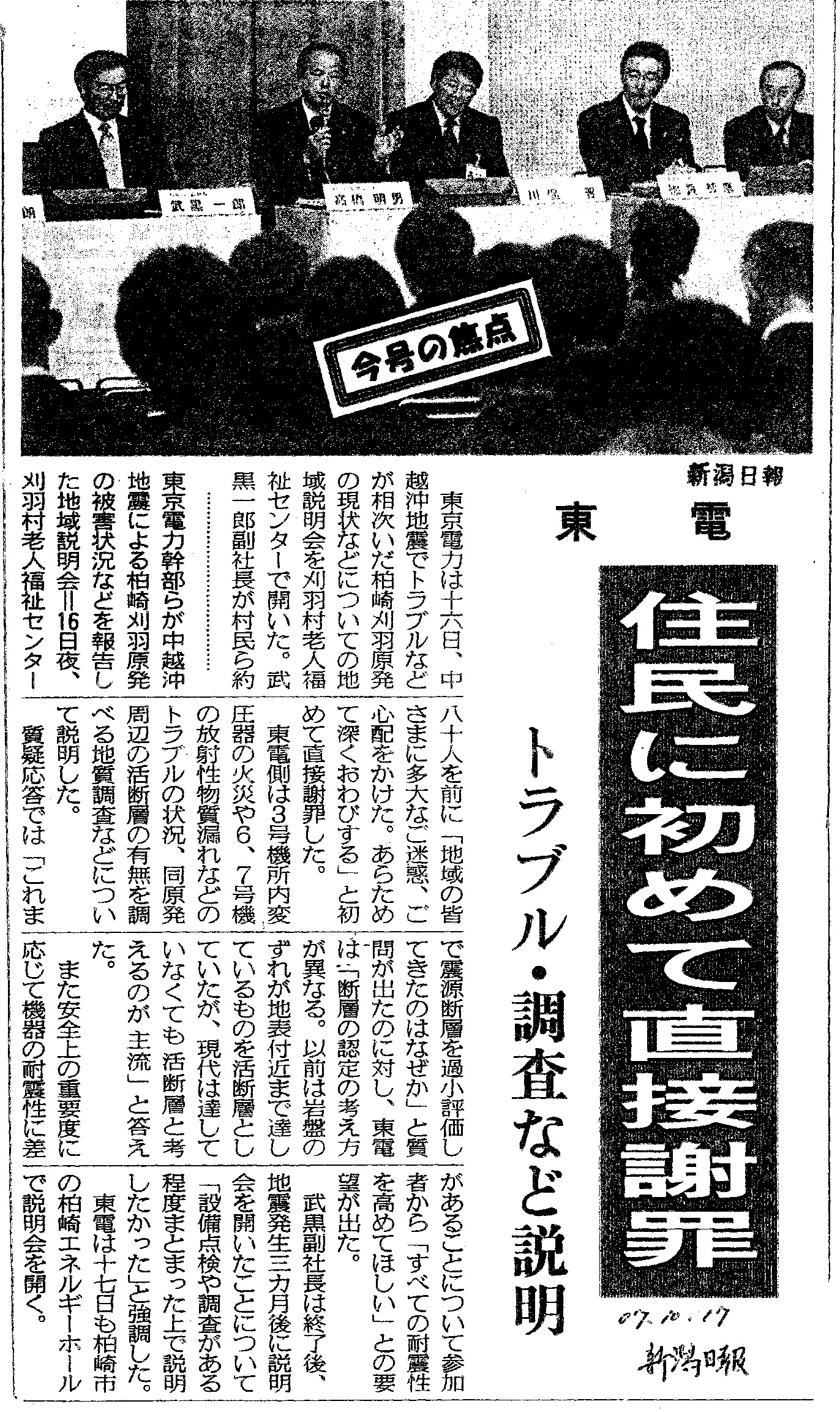 | [2007_10_17_01]東電 住民に初めて直接謝罪 トラブル・調査など説明(新潟日報2007年10月17日) |