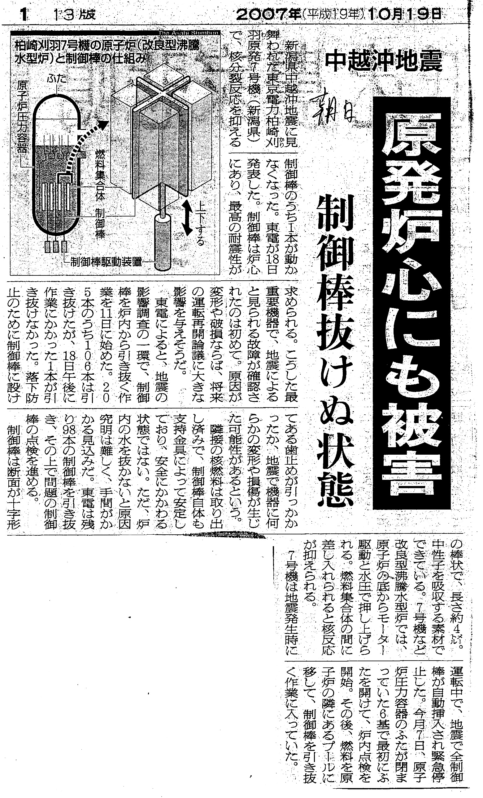 | [2007_10_19_01]中越沖地震 原発炉心にも被害 制御棒抜けぬ状態(朝日新聞2007年10月19日) |