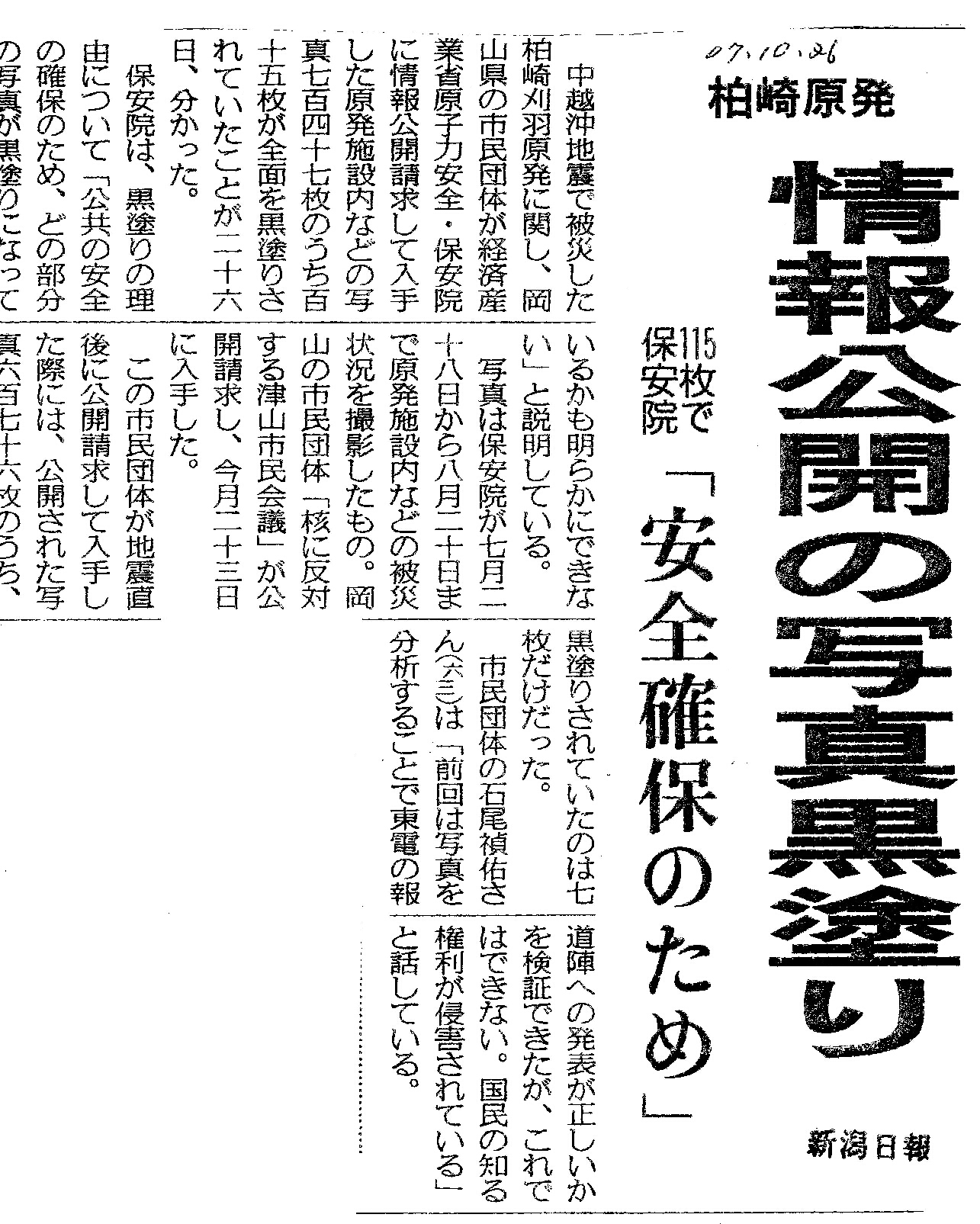 [2007_10_26_02]柏崎原発 情報公開の写真黒塗り 115枚で保安院 「安全確保のため」(新潟日報2007年10月26日)