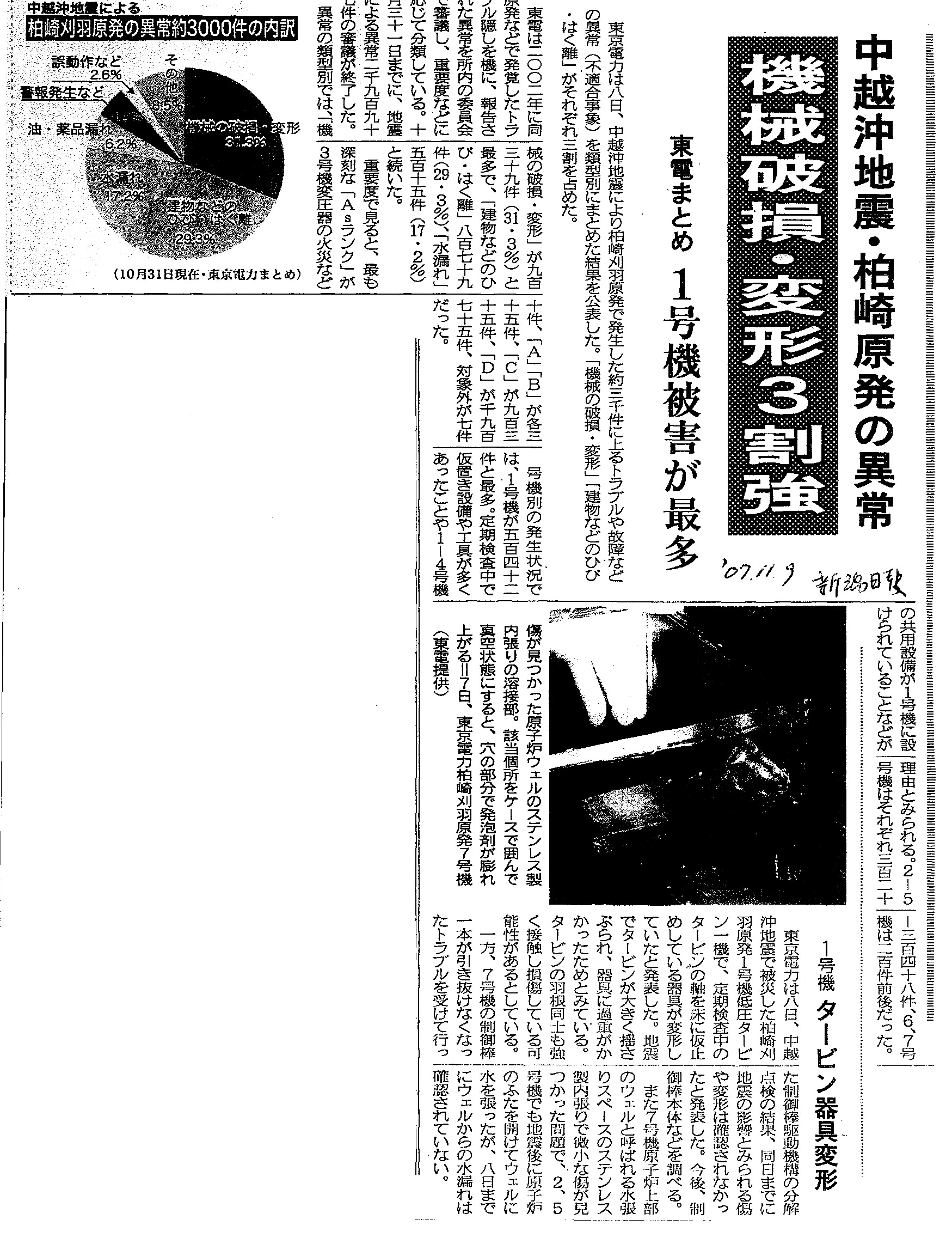 [2007_11_09_01]中越沖地震・柏崎原発の異常 機械破損・変形3割強 東電まとめ 1号機被害が最多 1号機 タービン器具変形(新潟日報2007年11月9日)