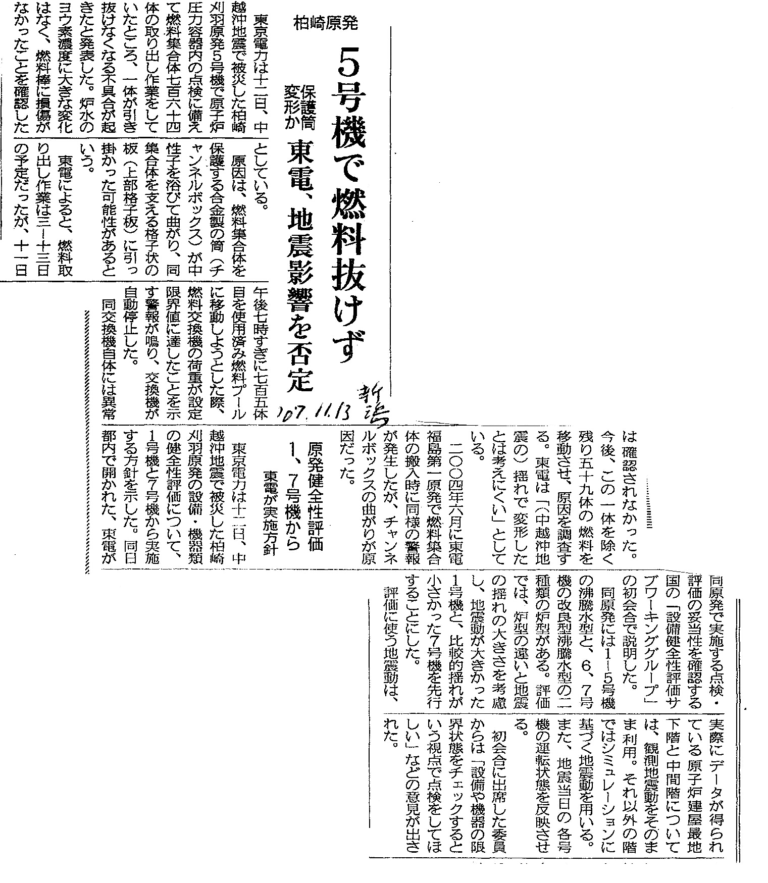[2007_11_13_01]柏崎原発 5号機で燃料抜けず 保護筒変形か 東電、地震影響を否定 原発健全性評価1,7号機から 東電が実施方針(新潟日報2007年11月13日)
