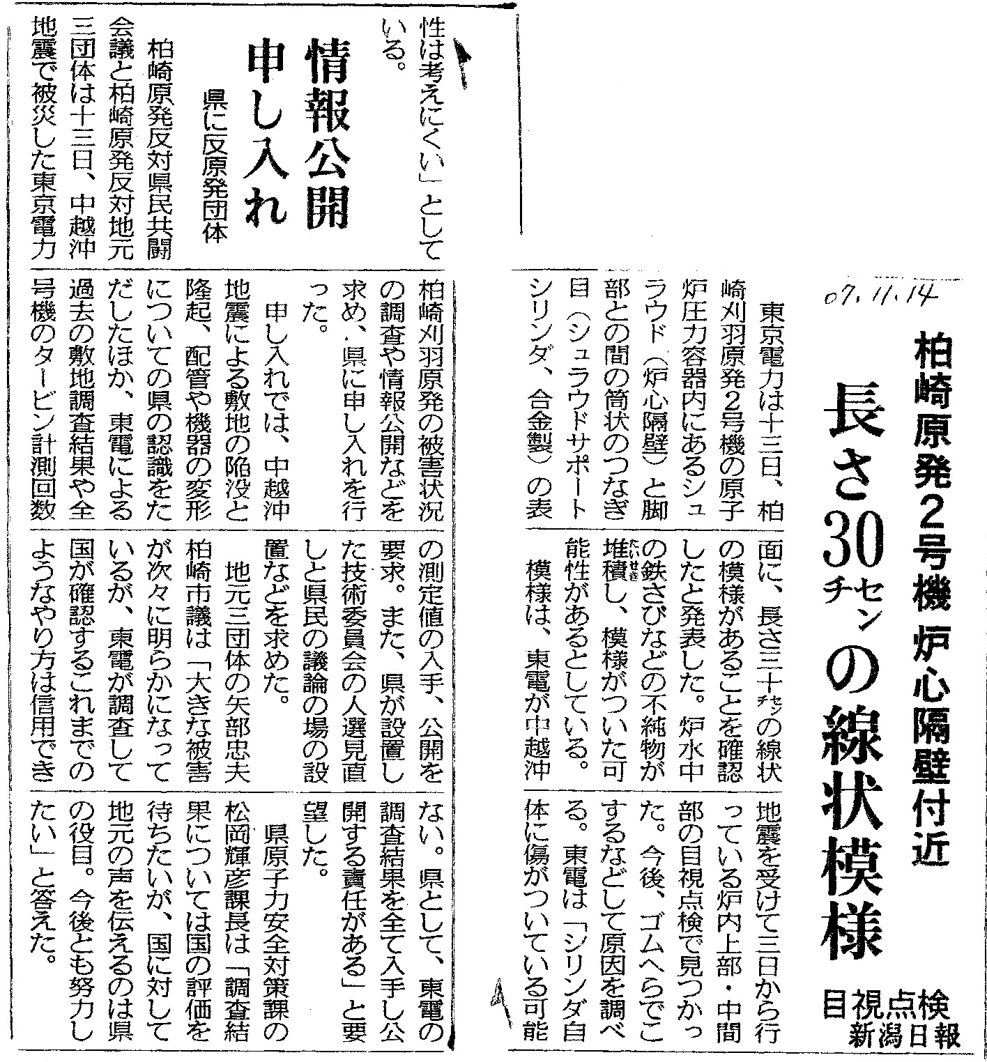 [2007_11_14_02]柏崎原発2号機 炉心隔壁付近 長さ30センチの線状模様 目視点検 情報公開申し入れ 県に反原発団体(新潟日報2007年11月14日)