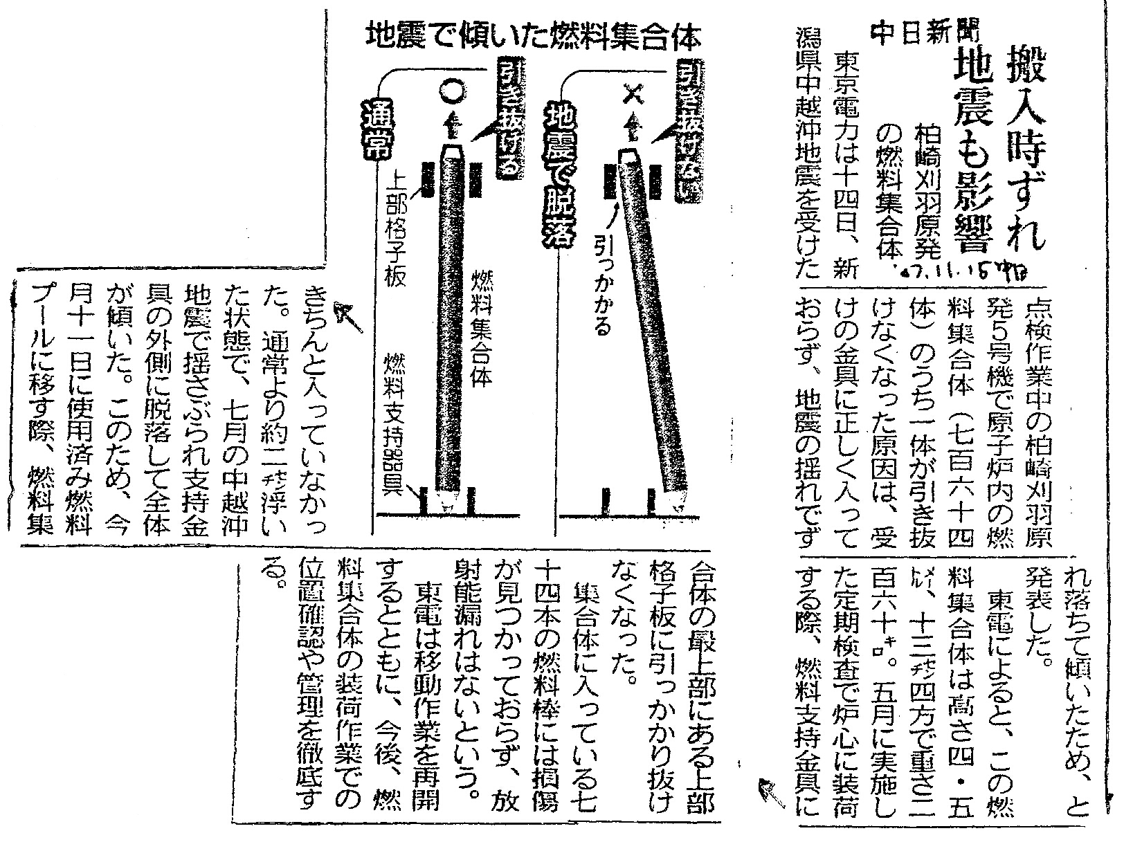 | [2007_11_15_01]搬入時ずれ 地震も影響 柏崎刈羽原発の燃料集合体(中日新聞2007年11月15日) |