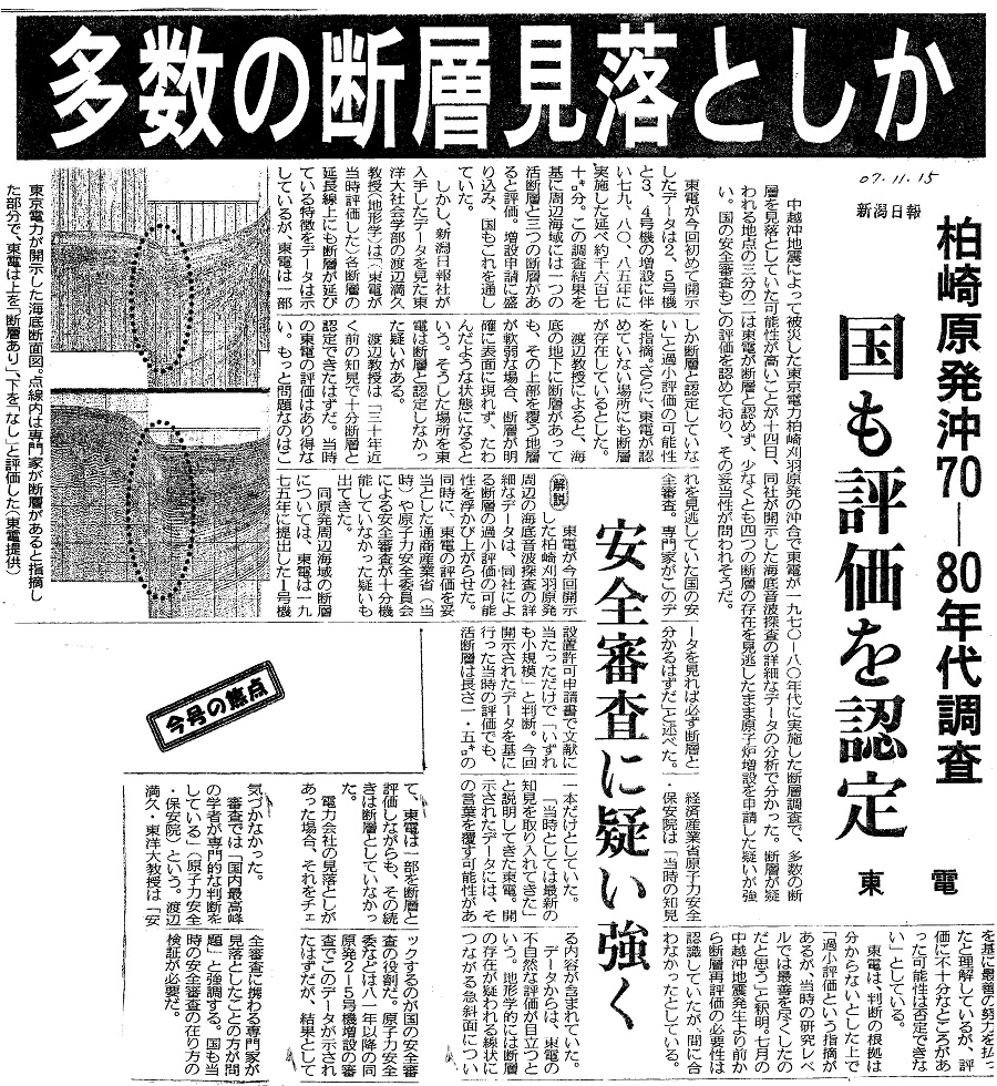 | [2007_11_15_02]多数の断層見落としか 柏崎原発沖70−80年代調査 国も評価を認定 東電 安全審査に疑い強く(新潟日報2007年11月15日) |
