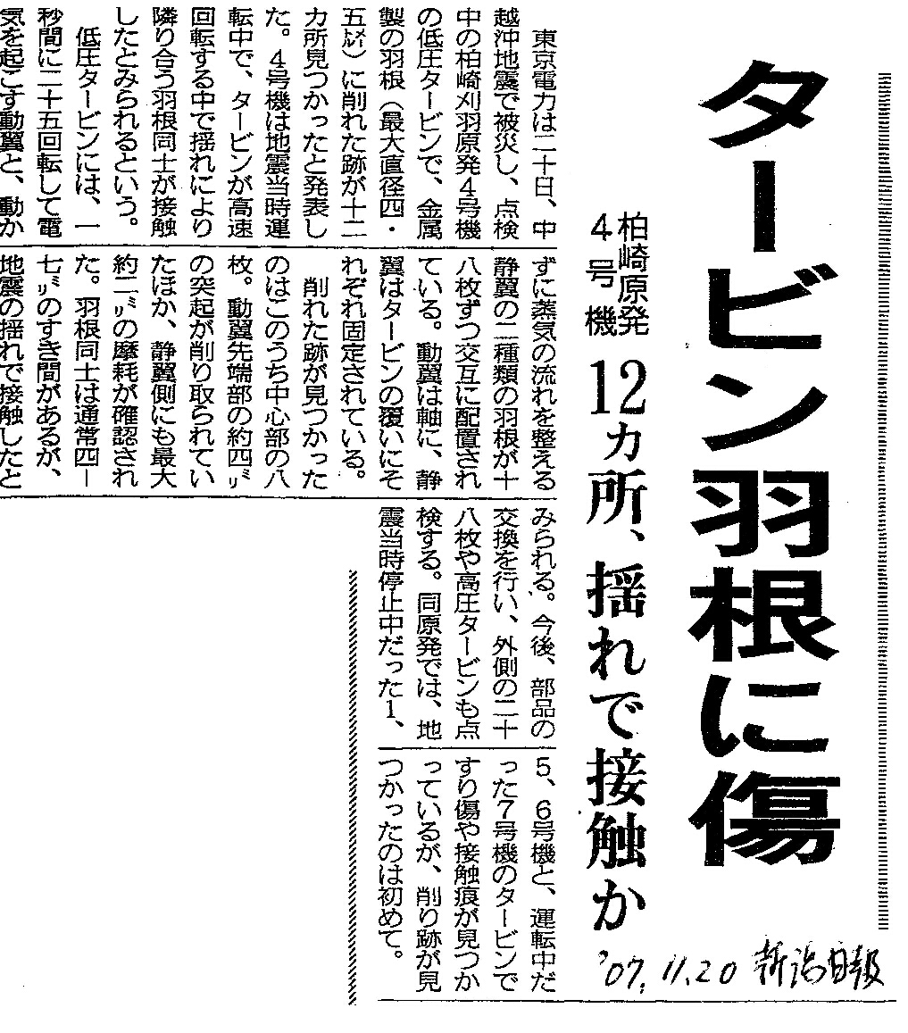 | [2007_11_20_02]タービン羽根に傷 柏崎原発4号機 12カ所、揺れで接触か(新潟日報2007年11月20日) |