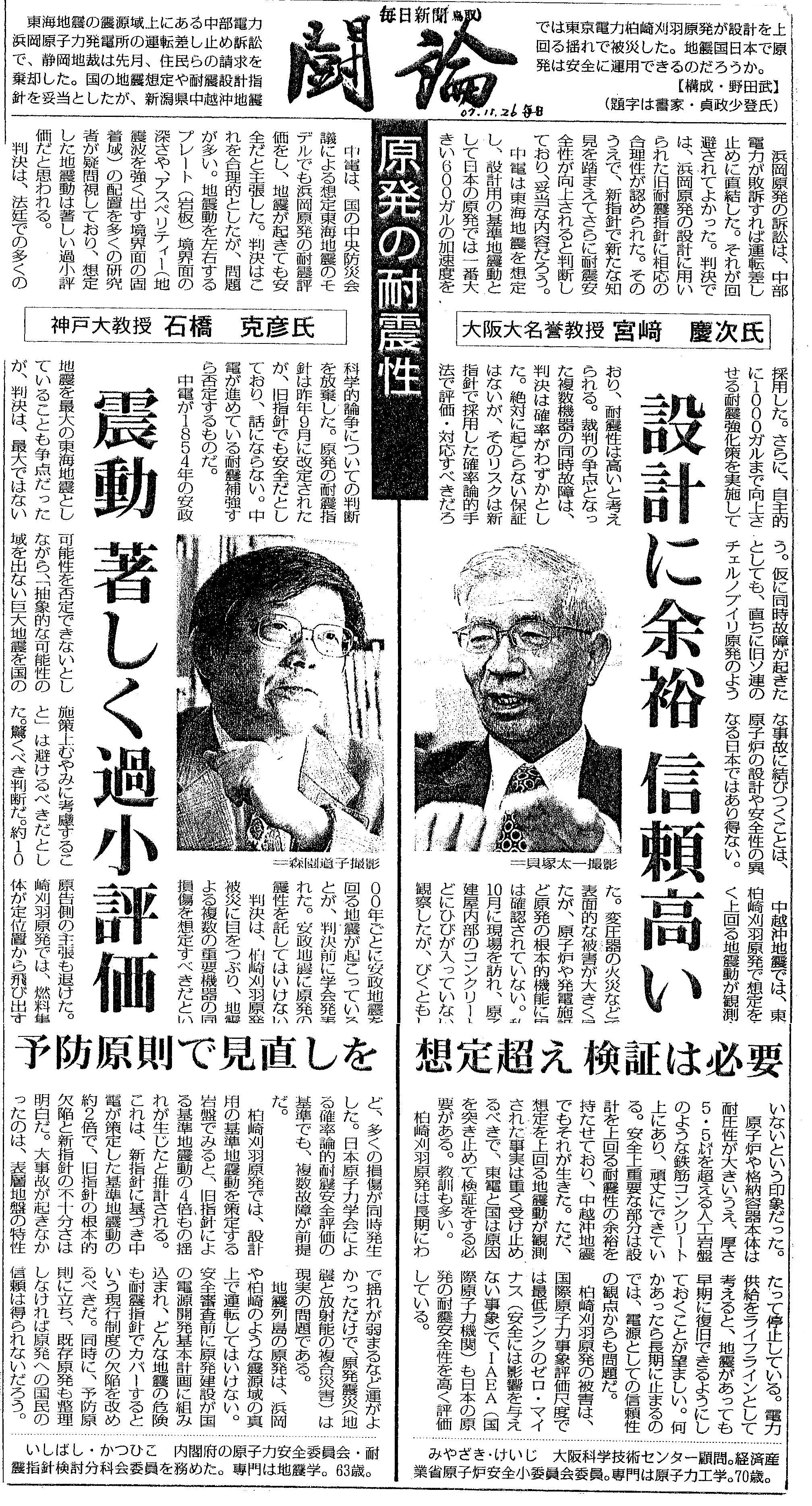 [2007_11_26_01]闘論 原発の耐震性 大阪大名誉教授 宮崎慶次氏 設計に余裕 信頼性高い 想定超え 検証は必要 神戸大教授 石橋克彦氏 振動 著しく過小評価 予防原則で見直しを(毎日新聞2007年11月26日)