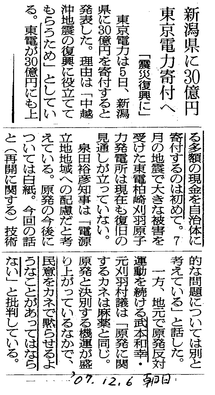 [2007_12_06_02]新潟県に30億円東京電力寄付へ 「震災復興に」(朝日新聞2007年12月6日)