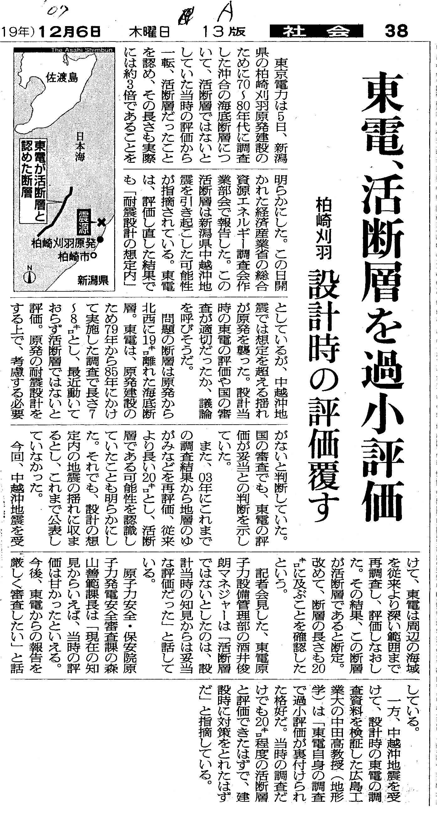 [2007_12_06_04]東電、活断層を過小評価 柏崎刈羽 設計時の評価覆す(朝日新聞2007年12月6日)