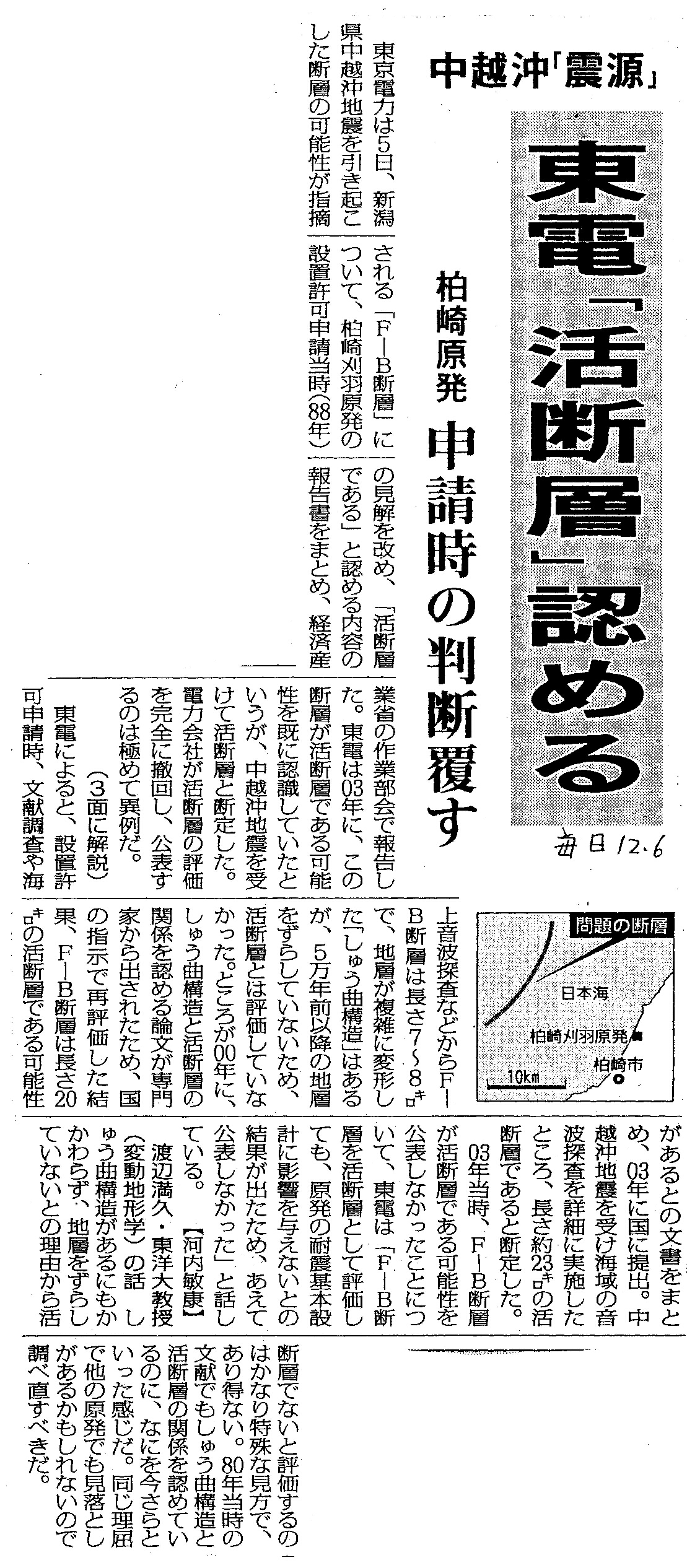 [2007_12_06_05]中越沖「地震」 東電「活断層」認める 柏崎原発 申請時の判断覆す(毎日新聞2007年12月6日)
