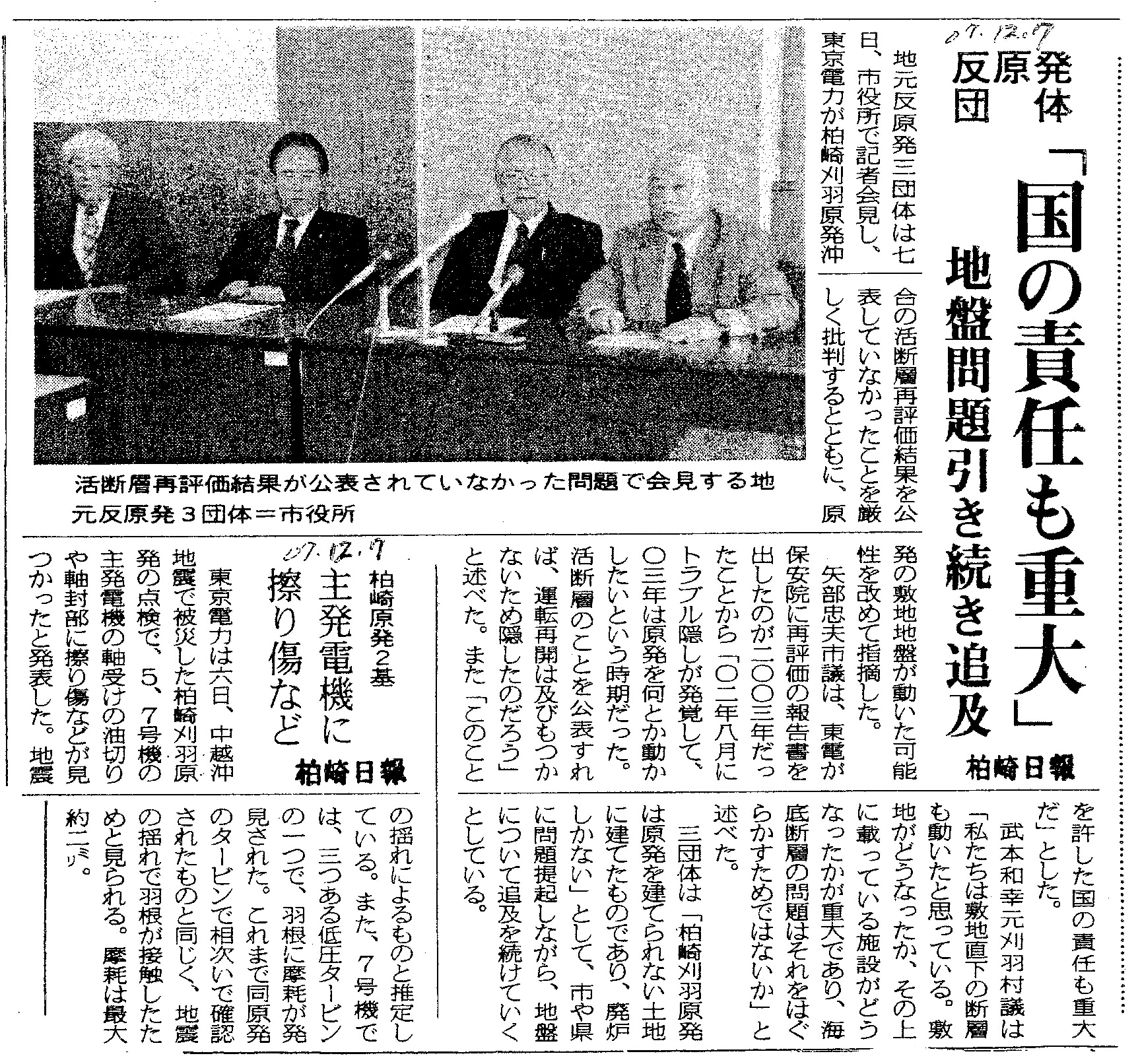 [2007_12_07_01]反原発団体 「国の責任も重大」 地盤問題引き続き追及 柏崎原発2基 主発電機に擦り傷など(柏崎日報2007年12月7日)