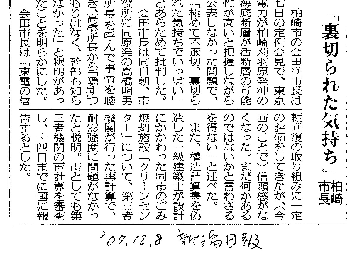 [2007_12_08_02]「裏切られた気持ち」柏崎市長(新潟日報2007年12月8日)