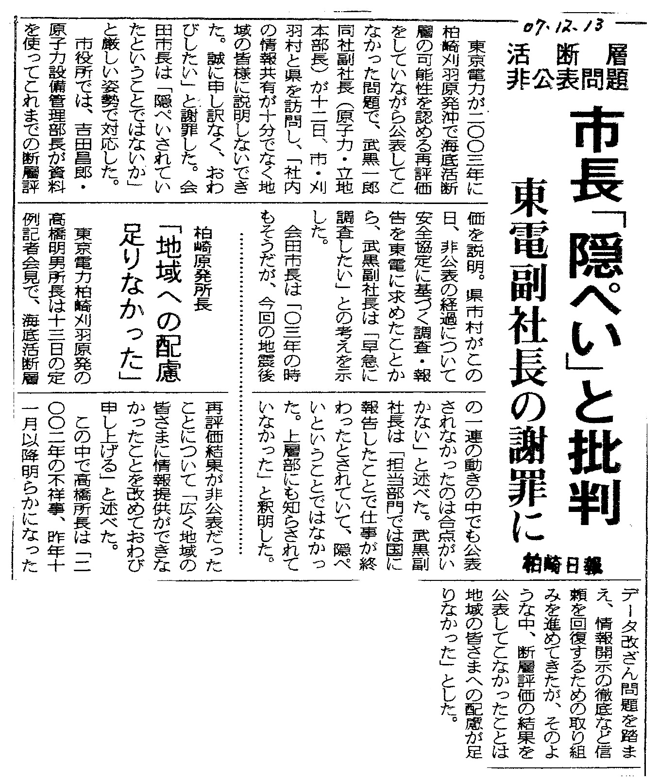 | [2007_12_13_01]活断層非公表問題 市長「隠ぺい」と批判 東電副社長の謝罪に 柏関原発所長「地域への配慮足りなかった」(柏崎日報2007年12月13日) |