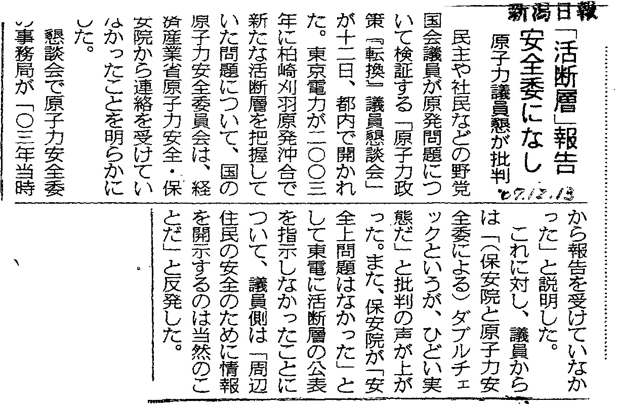 [2007_12_13_02]「活断層」報告 安全委になし 原子力議員懇が批判(新潟日報2007年12月13日)