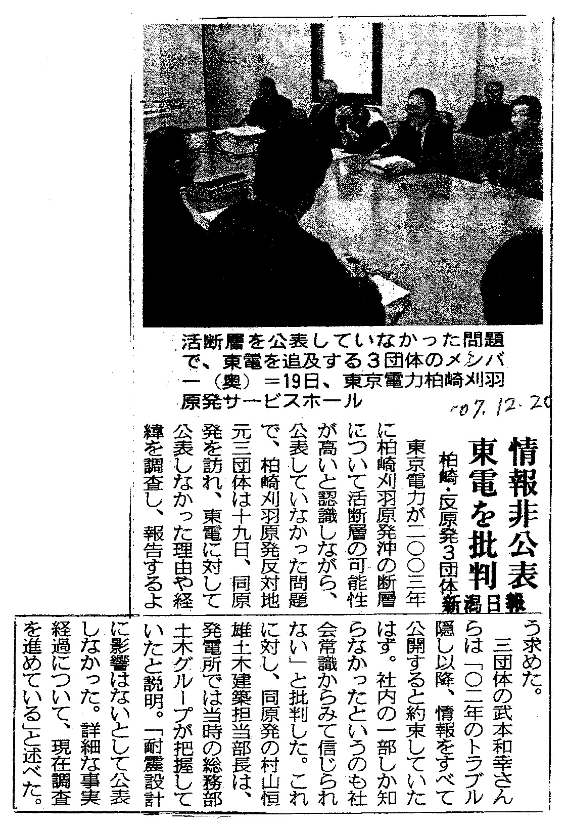 | [2007_12_20_01]情報非公表 東電を批判 柏崎・反原発3団体(新潟日報2007年12月20日) |