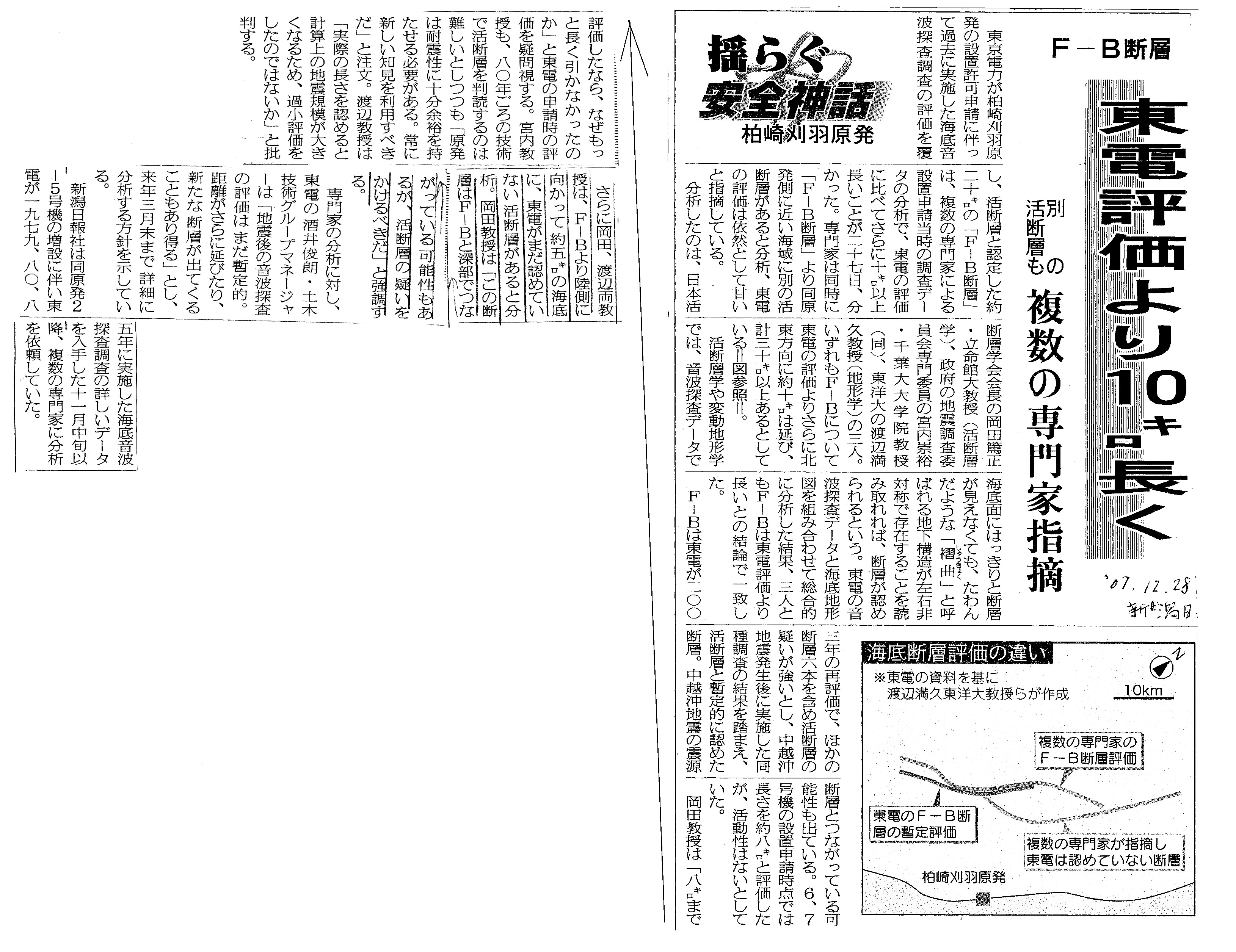 | [2007_12_28_01]揺らぐ安全神話 柏崎刈羽原発 F-B断層 東電評価より10キロ長く 別の活断層も 複数の専門家指摘(新潟日報2007年12月28日) |