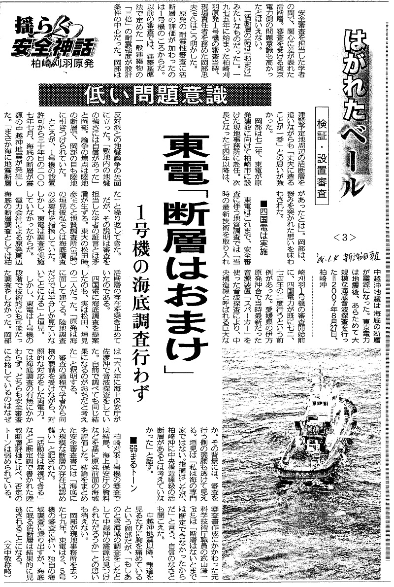 ※以下は上記本文中から重要と思われるヶ所を抜粋し、テキスト化したものである 安全審査を担当した学者の間で、関心に差が表れた活断層。審査を受ける東京電力側の問題意識も高かったとはいえない。 「活断層の話は『おまけ』みたいなものだった」。一九七五年に始まった柏崎刈羽原発1号機の審査当時、現場責任者を務めた岡部忠夫(七六)はこう明かした。 原発の耐震性審査に活断層の評価が加わったのは1号機のころからだ。以前の審査では、建築基準法で定めた一般建築物の「三倍」の耐震強度が設計条件の中心だった。岡部は建設予定地周辺の活断層を追いながらも「丈夫に造ることが一番」との思いが強かった。 岡部は七二年、東電が原発建設に向けて柏崎市に設けた現地事務所に赴任。次長となった七四年以降は、反対派との地盤論争の矢面に立った。「敷地内の地盤の強さには自信があった」と岡部。論争の焦占は陸地の断層で、岡部の目も陸地に引きつけられていた。 ところが、1号機の設置許可から三十年目の二〇〇七年七月、海底の断層が震源の中越沖地震が発生した。「まさか海に地震断層があったとは」。岡部は、弱みを突かれた思いを味わわされた。 ■四国電は実施 東電はこれまで、安全審査に伴う地質調査では「当時の最新技術を取り入れた」と繰り返してきた。 だが、その説明は審査を担当した学者の証言とは矛盾が生ずる。東大の松田時彦(七六)と地質調査所(当時)の垣見俊弘(七八)は海底調査の必要性を指摘していた。しかし、東電は調査を実施していなかったからだ。 電力会社による原発周辺海底の断層調査としては柏崎刈羽1号機の審査開始前に、四国電力が既に七二、七四年の二度行うという前例があった。愛媛県の伊方原発沖合で当時最新だった音源装置「スパーカー」を使った音波探査により、中央構造線と呼ばれる巨大な活断層の存在を突き止めていたのである。 四国電に海底調査を提案したのも、実は松田、垣見の二人だった。「原発は海に面して建てる。陸地調査だけでは半分しか見ていないことになる」と垣見。 しかし、東電は1号機の段階で技術的にも可能だった調査をしなかった。岡部は「六八年に海上保安庁が佐渡沖で音波探査をしていた。自前で調べても同じ結果になるのがおちだと考えた」と釈明する。 審査の過程で学者から同様の要請を受けながら、対照的な対応をした両電力。では海底調査の有無にかかわらず、どちらも安全審査に合格しているのはなぜか。その背景には、審査を行う側の弱腰も透けて見える。垣見は「私は海の専門家ではない。指摘はしたが、柏崎沖に中央構造線級の活断層があるとは考えていなかった」と話す。 ■弱まる卜−ン 柏崎刈羽1号機の審査では結局、海上保安庁の資料などを基に原発前面の海域を評価した。結論をまとめた安全審査書には「海底に大規模な断層の存在は認め難い」と記された。 「活動性は無視できる」などと断定調で書かれた陸域断層評価に比べ、否定のトーンは弱められている。審査書作成にかかわった元科学技術庁員の武山謙一(五七)は「断層はないとまでは断定できなかったからだ」と言う。自信のなさとも聞こえた。 中越沖地震以降、報道を見るたびに胸を痛めているという岡部だが、「もしあのとき海域の調査をしたとして中越沖の震源は見つけられただろうか」との思いも消えない。 岡部が現地事務所を去った七九年。東電は2、5号機の審査に伴い、独自の海域調査に乗り出すが、海底に眠る活断層は結果的に見逃されることになる。 (文中敬称略) |