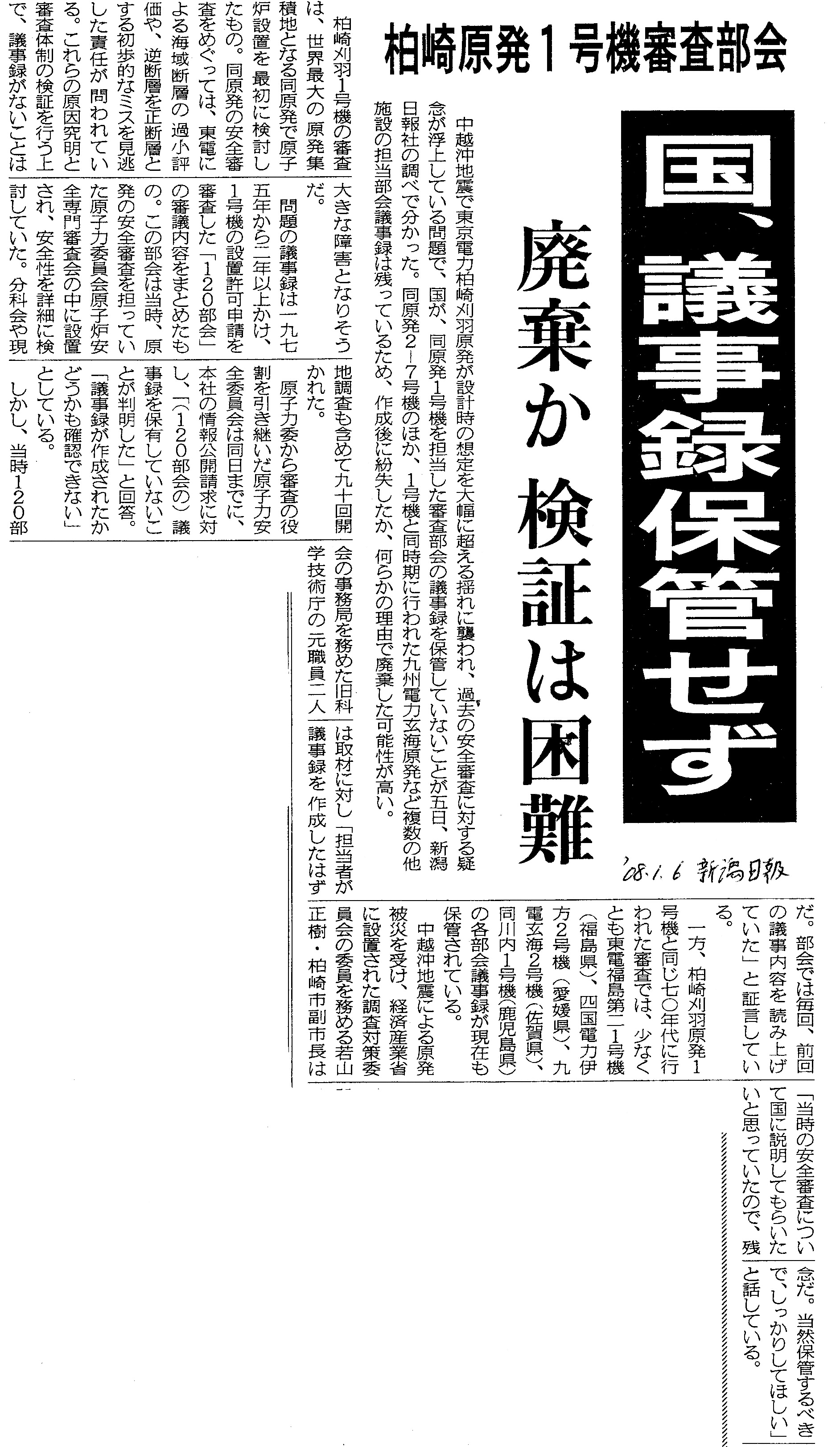 | [2008_01_06_02]柏崎原発1号機審査部会 国、議事録保管せず 廃棄か 検証は困難(新潟日報2008年1月6日) |