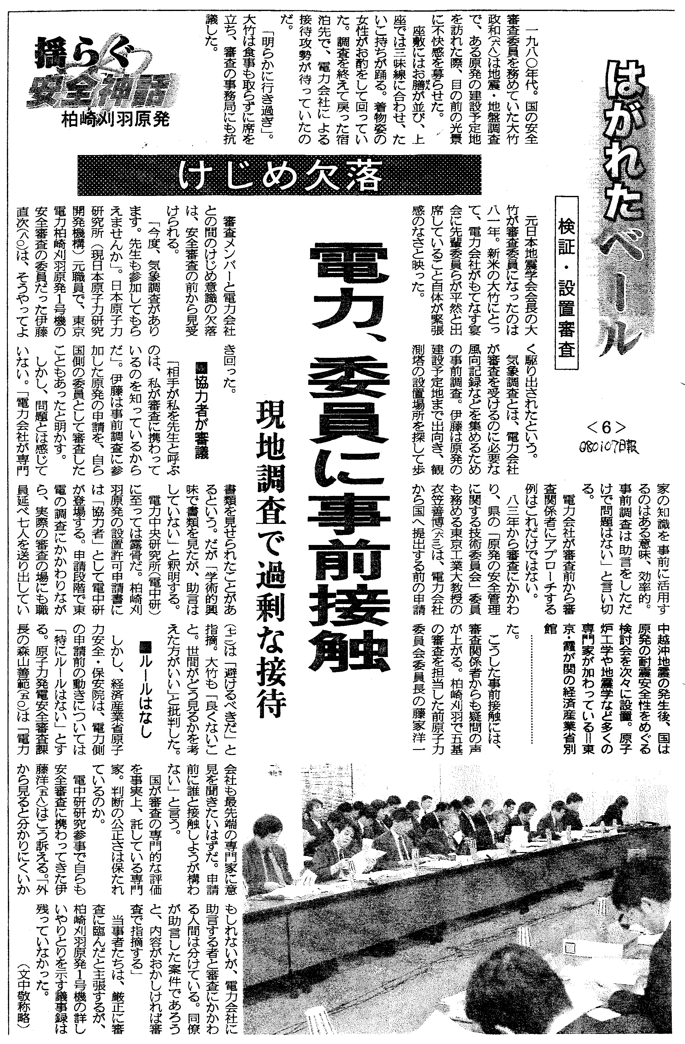| [2008_01_07_01]揺らぐ安全神話 柏崎刈羽原発 はがれたベール 検証・設置審査 <6> けじめ欠落 電力、委員に事前接触 現地調査で過剰な接待 協力者が審議 ルールはなし(新潟日報2008年1月7日) |
