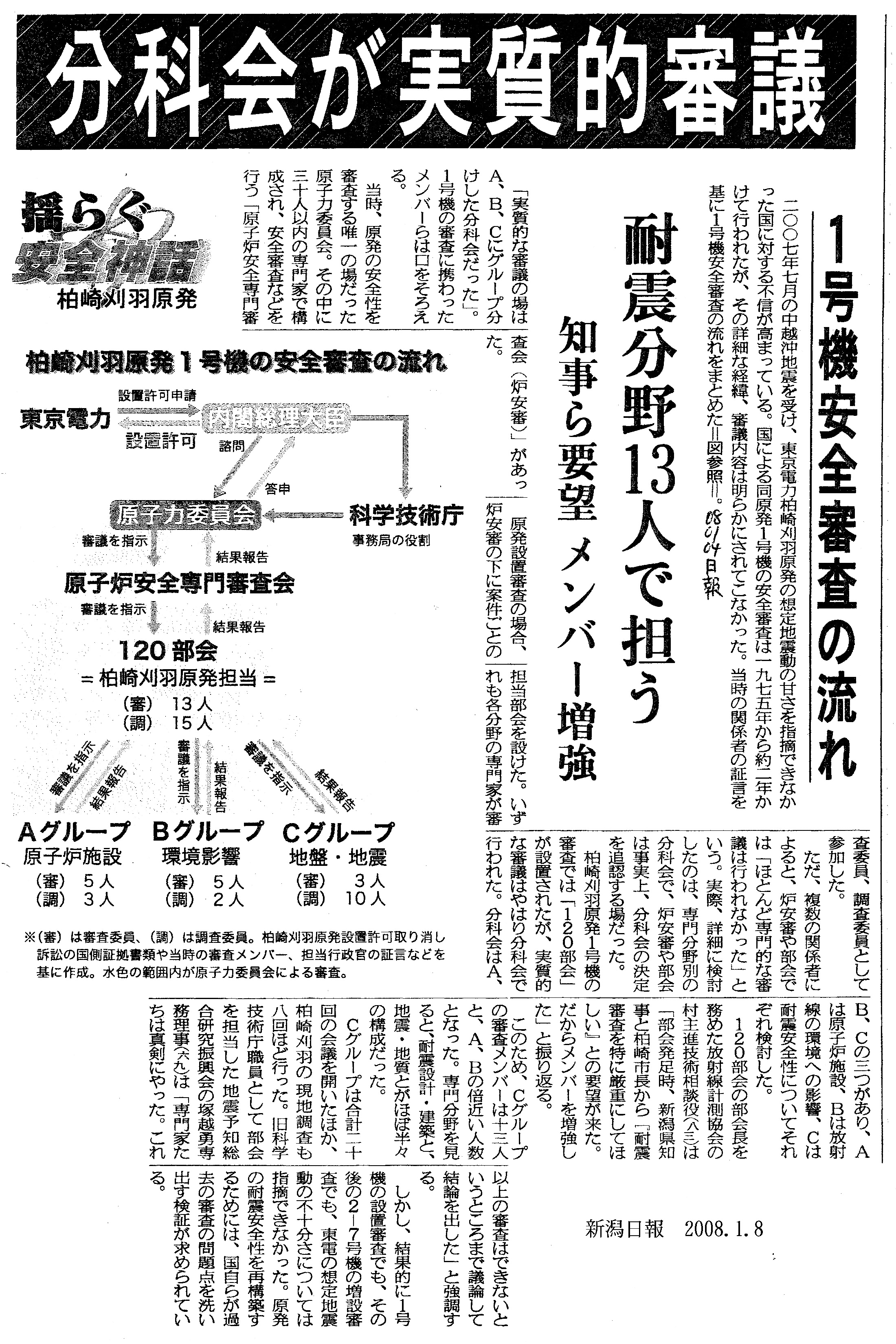 [2008_01_08_02]揺らぐ安全神話 柏崎刈羽原発 1号機安全審査の流れ 耐震分野13人で担う 知事ら要望 メンバー増強(新潟日報2008年1月8日)