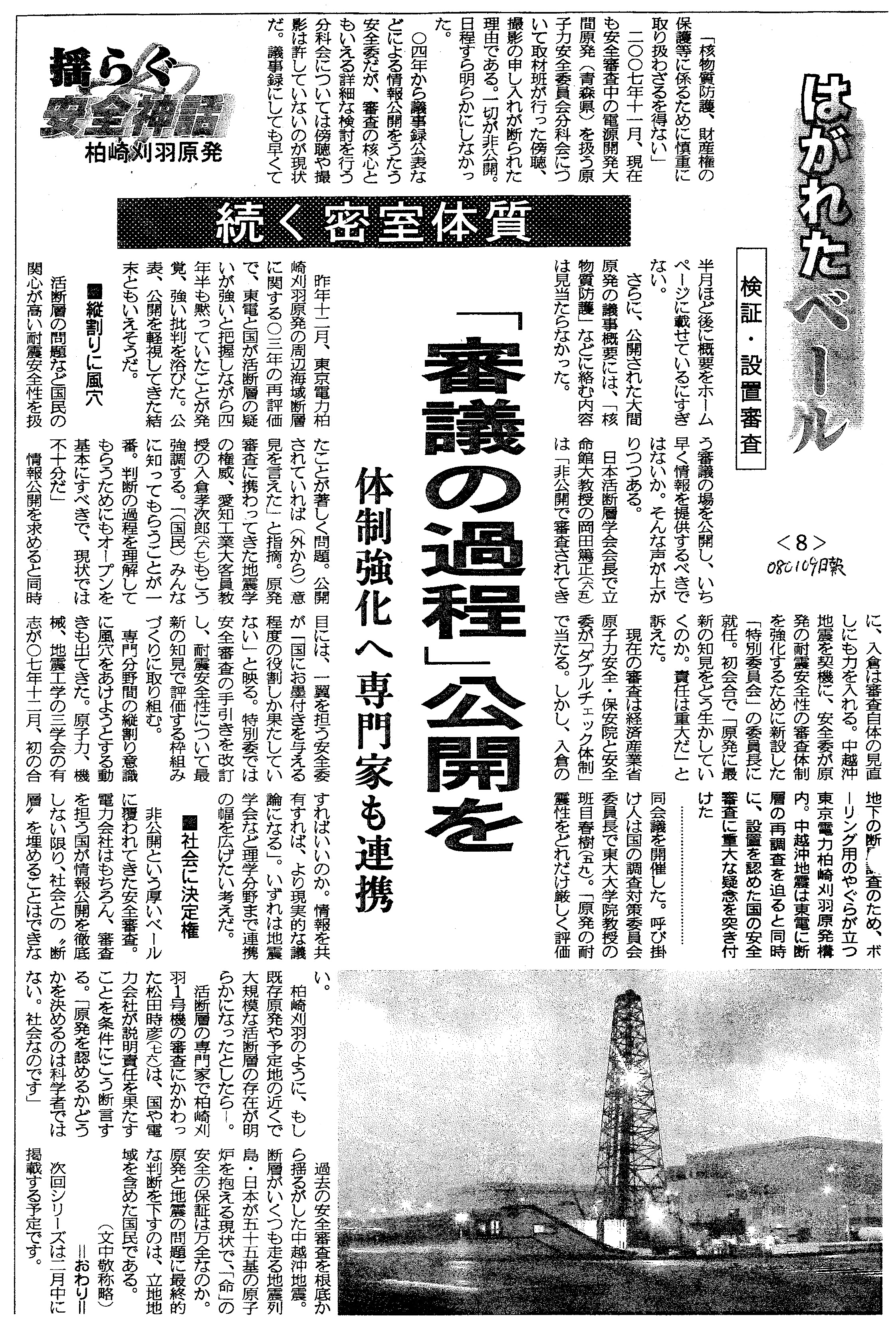| [2008_01_09_01]揺らぐ安全神話 柏崎刈羽原発 はがれたベール 検証・設置審査 <8> 続く密室体質 「審議の過程」公開を 体制強化へ専門家も連携 縦割りに風穴 社会に決定権(新潟日報2008年1月9日) |