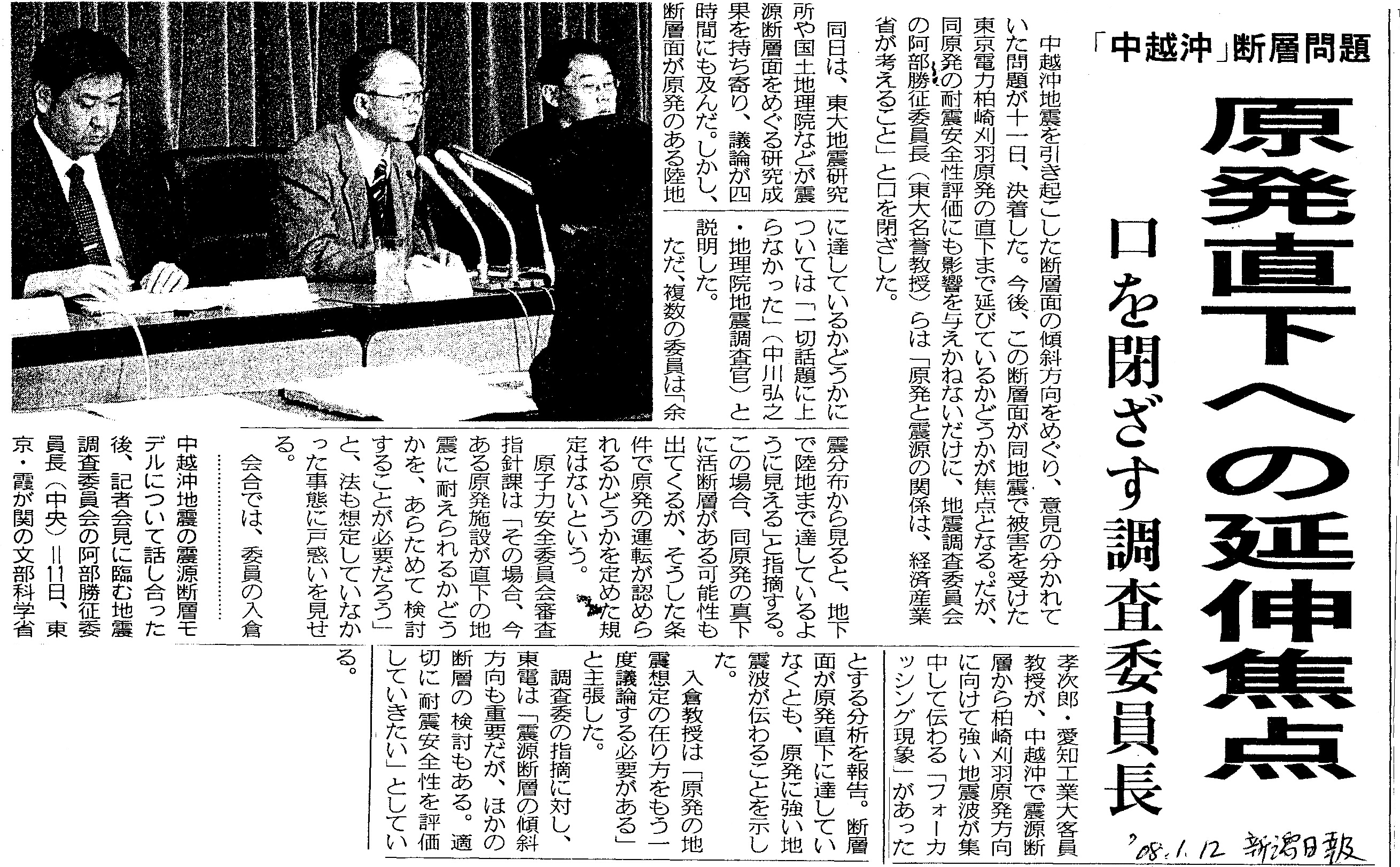 | [2008_01_12_01]「中越沖」断層問題 原発直下への延伸焦点 口を閉ざす調査委員長(新潟日報2008年1月12日) |