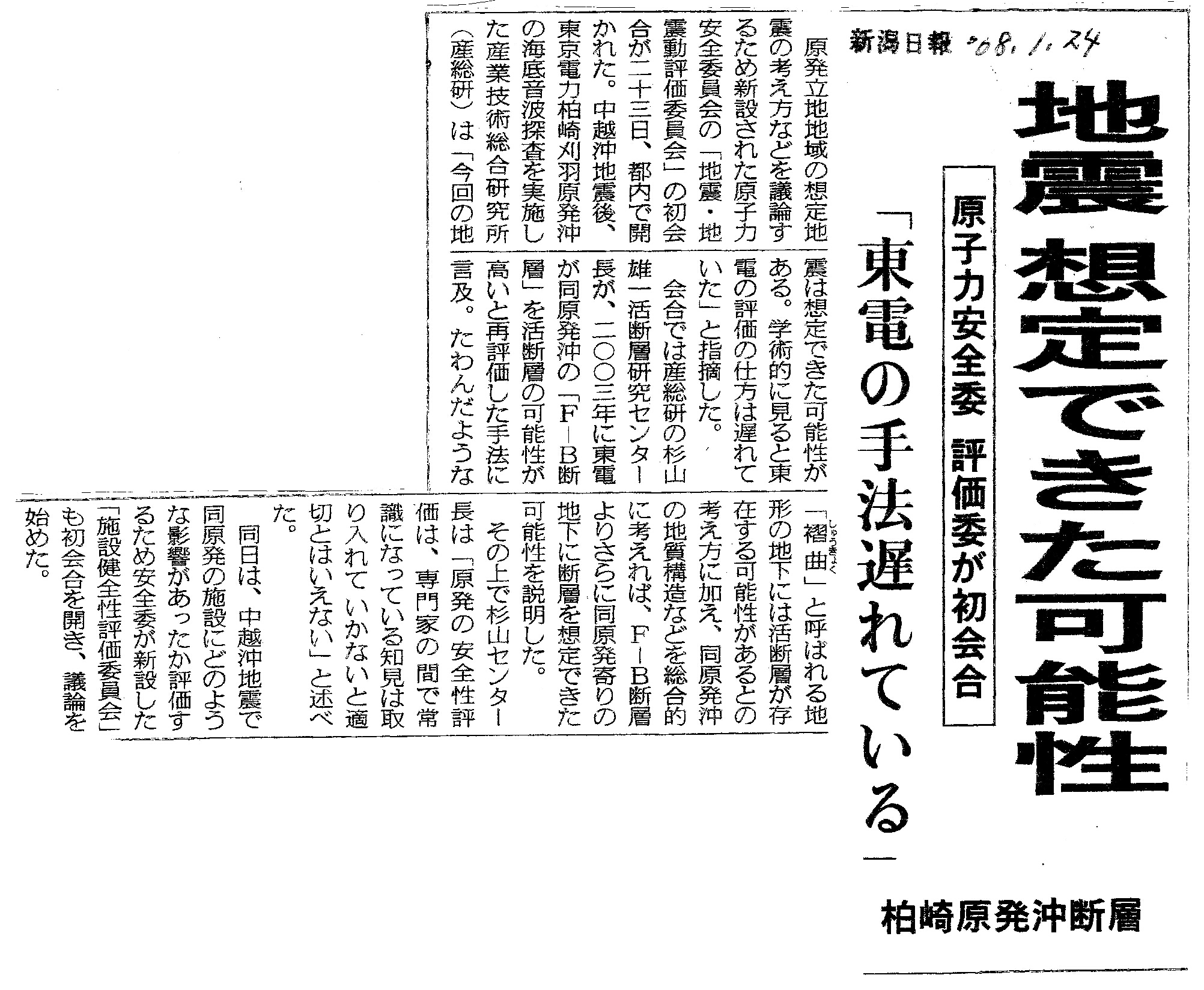[2008_01_24_01]地震 想定できた可能性 原子力安全委 評価委が初会合 「東電の手法遅れている」 柏崎原発沖断層(新潟日報2008年1月24日)