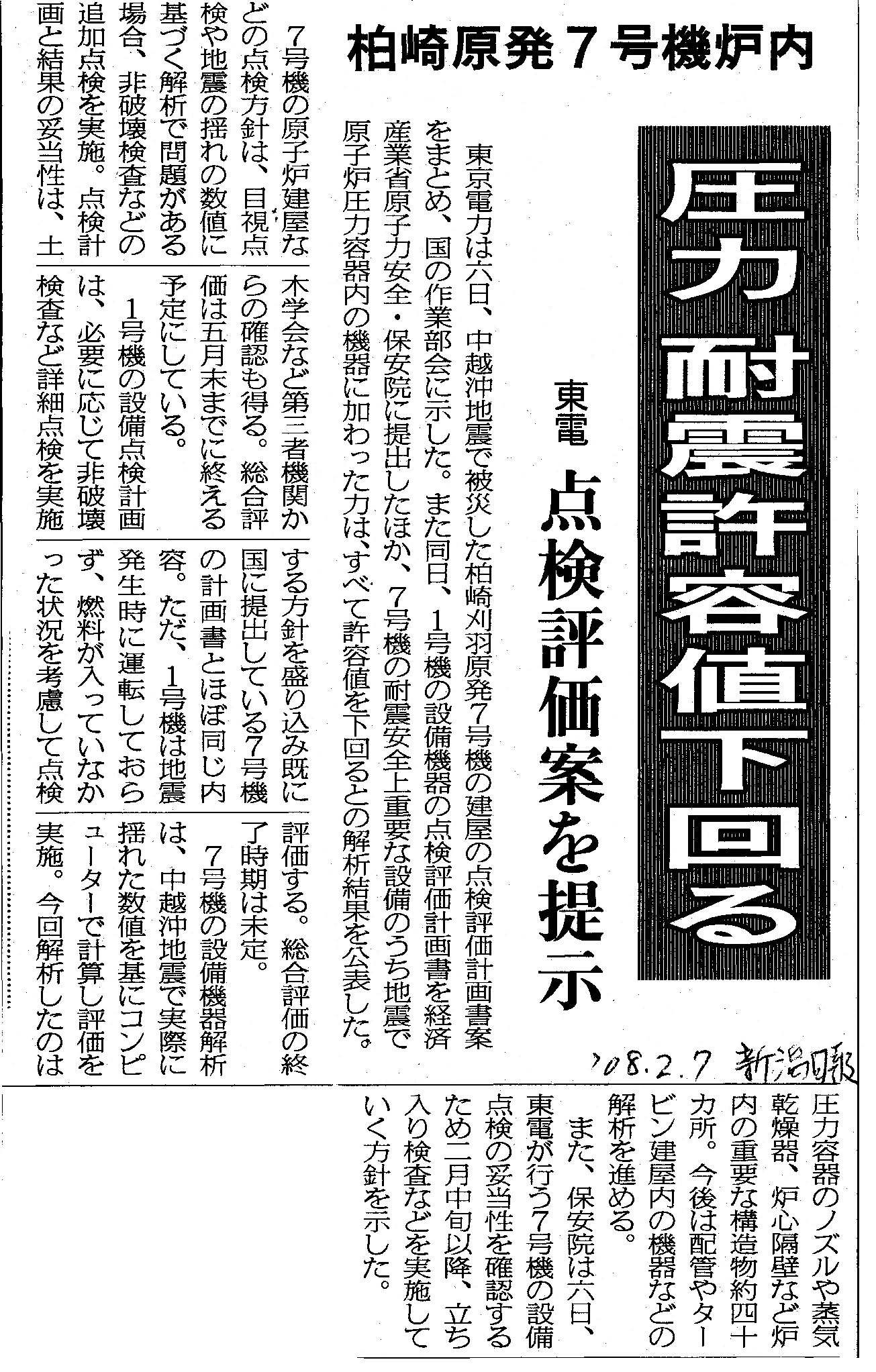 | [2008_02_07_01]柏崎原発7号機炉内 圧力耐震許容値下回る 東電 点検評価案を掲示(新潟日報2008年2月7日) |
