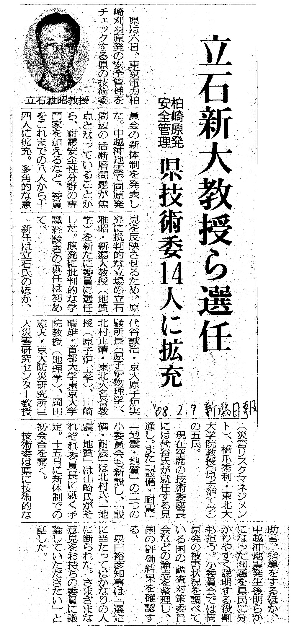 [2008_02_07_02]立石新大教授ら選任 柏崎原発安全管理 県技術委14人に拡充(新潟日報2008年2月7日)