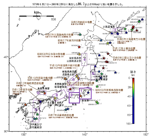 [2008_02_18_01]【別紙4】特定観測地域(8地域)と観測強化地域(2地域)の概略位置と主な地震(国土地理院2008年2月18日)