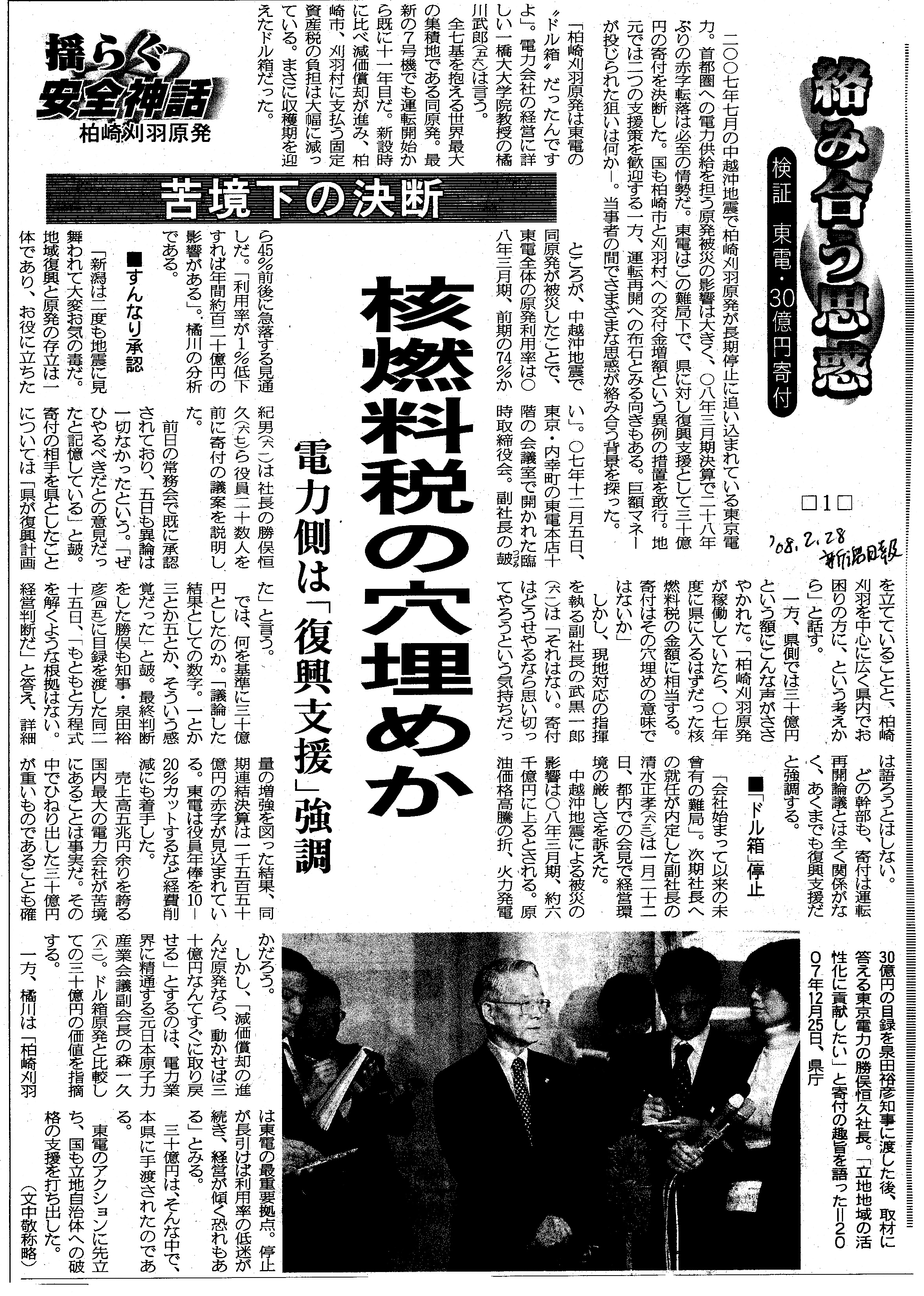 [2008_02_28_01]揺らぐ安全神話 柏崎刈羽原発 絡み合う思惑 検証 東電・30億円寄付 □1□ 苦境下の決断 核燃料税の穴埋めか 電力側は「復興支援」強調 すんなり承認 「ドル箱」停止(新潟日報2008年2月28日)