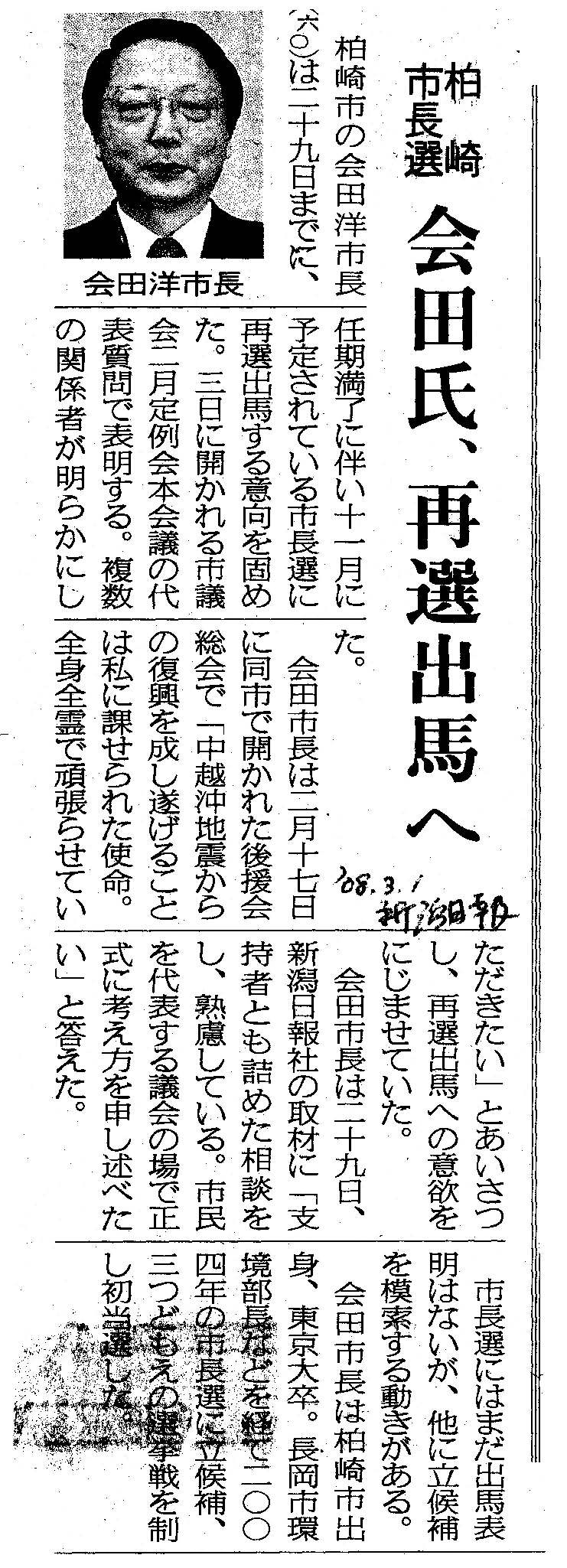 [2008_03_01_03]柏崎市長選 会田氏、再選出馬へ(新潟日報2008年3月1日)