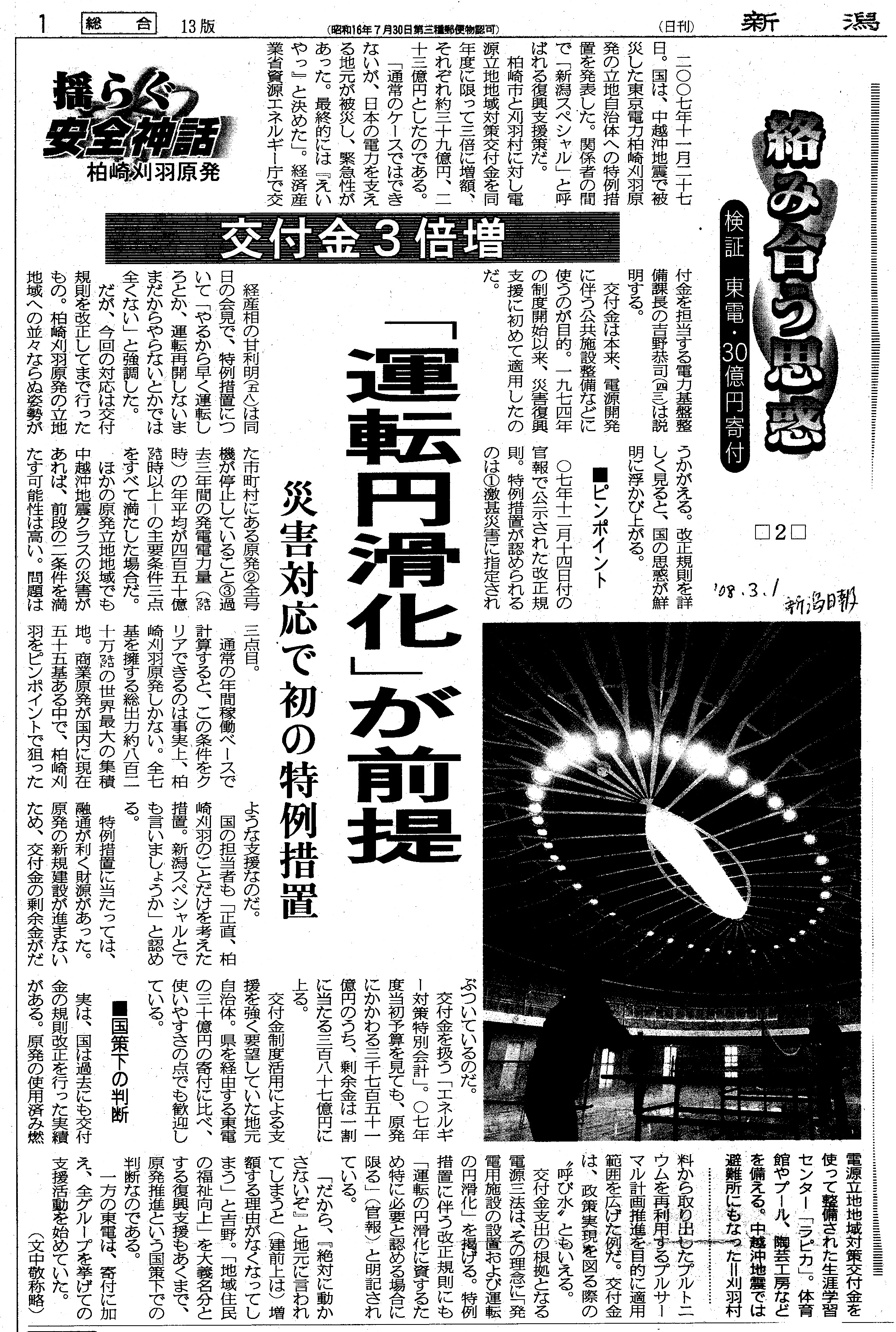 [2008_03_01_04]揺らぐ安全神話 柏崎刈羽原発 絡み合う思惑 検証 東電・30億円寄付 □2□ 交付金3倍増 「運転円滑化」が前提 災害対応で初の特例措置 ピンポイント 国策化の判断(新潟日報2008年3月1日)