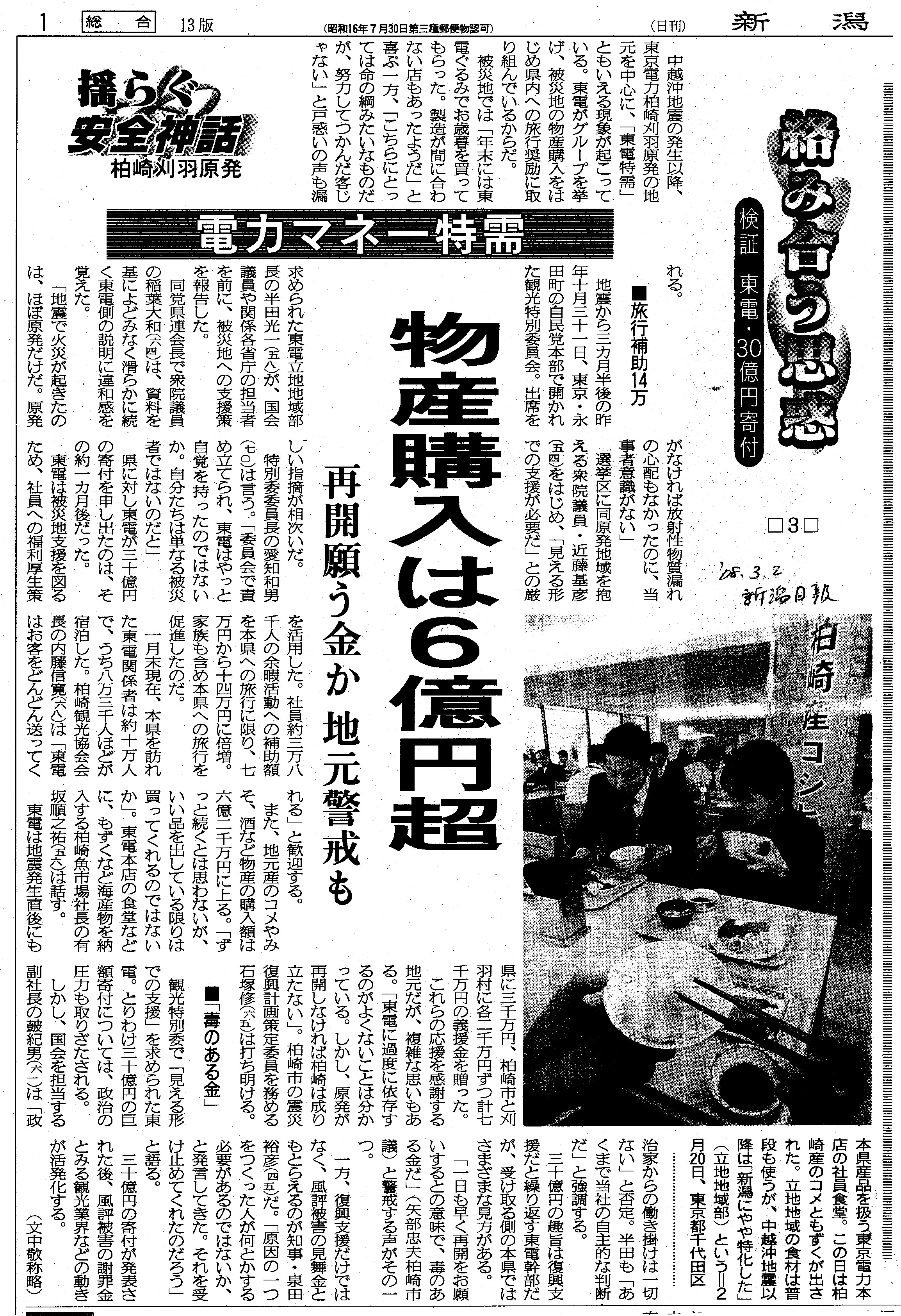| [2008_03_02_01]揺らぐ安全神話 柏崎刈羽原発 絡み合う思惑 検証 東電・30億円寄付 □3□ 電力マネー特需 物産購入は6億円超 再開願う金か 地元警戒も 旅行補助14万 「毒のある金」(新潟日報2008年3月2日) |