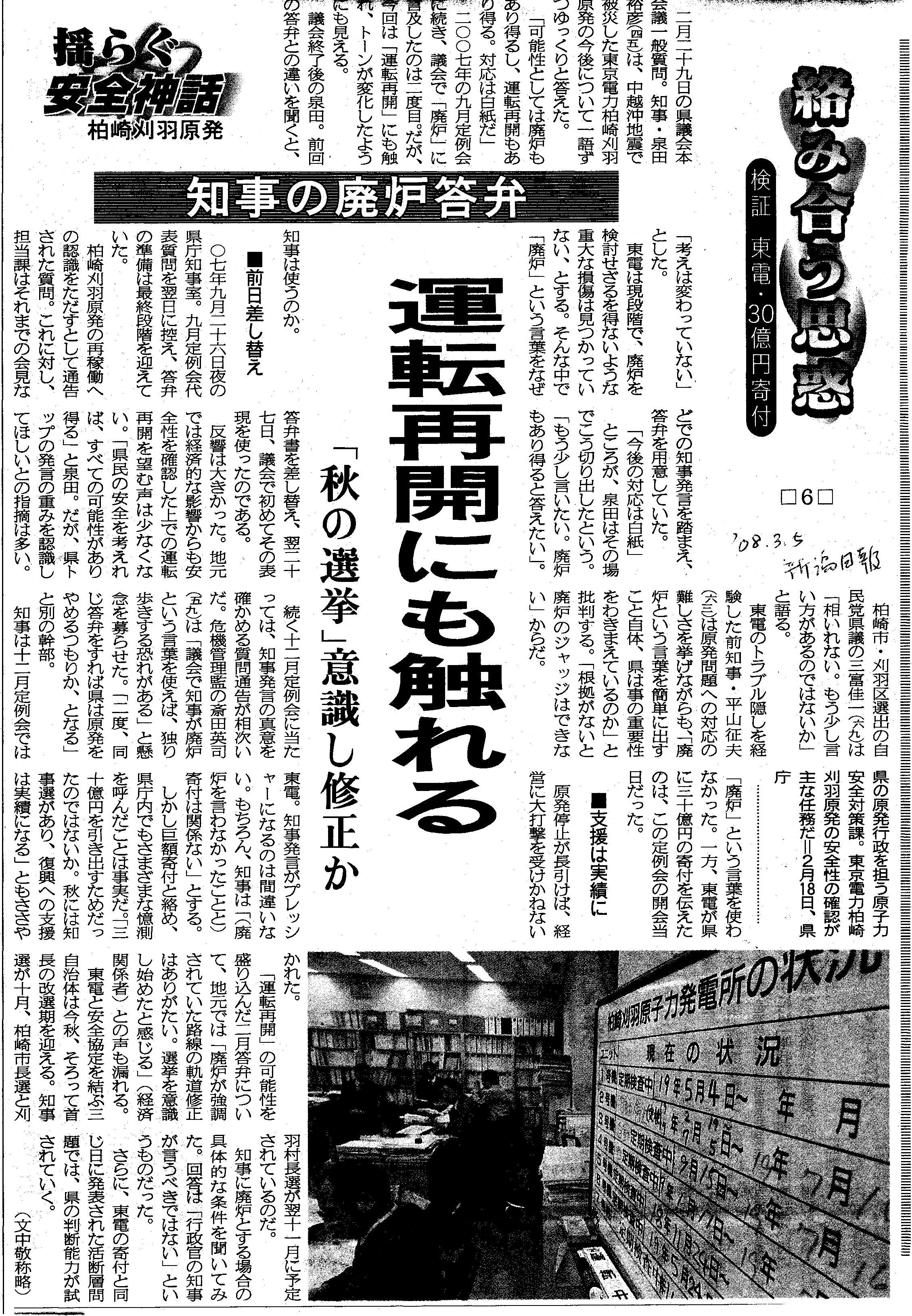 [2008_03_05_01]揺らぐ安全神話 柏崎刈羽原発 絡み合う思惑 検証 東電・30億円寄付 □6□ 知事の廃炉答弁 運転再開にも触れる 「秋の選挙」意識し修正か 前日差し替え 支援は実績に(新潟日報2008年3月5日)