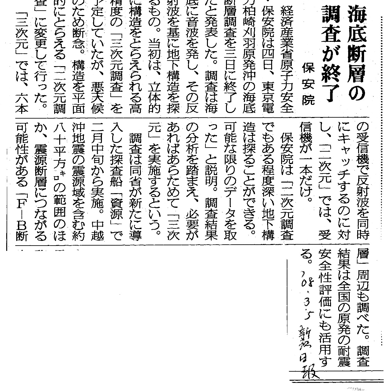 | [2008_03_05_02]海底断層の調査が終了 保安院(新潟日報2008年3月5日) |