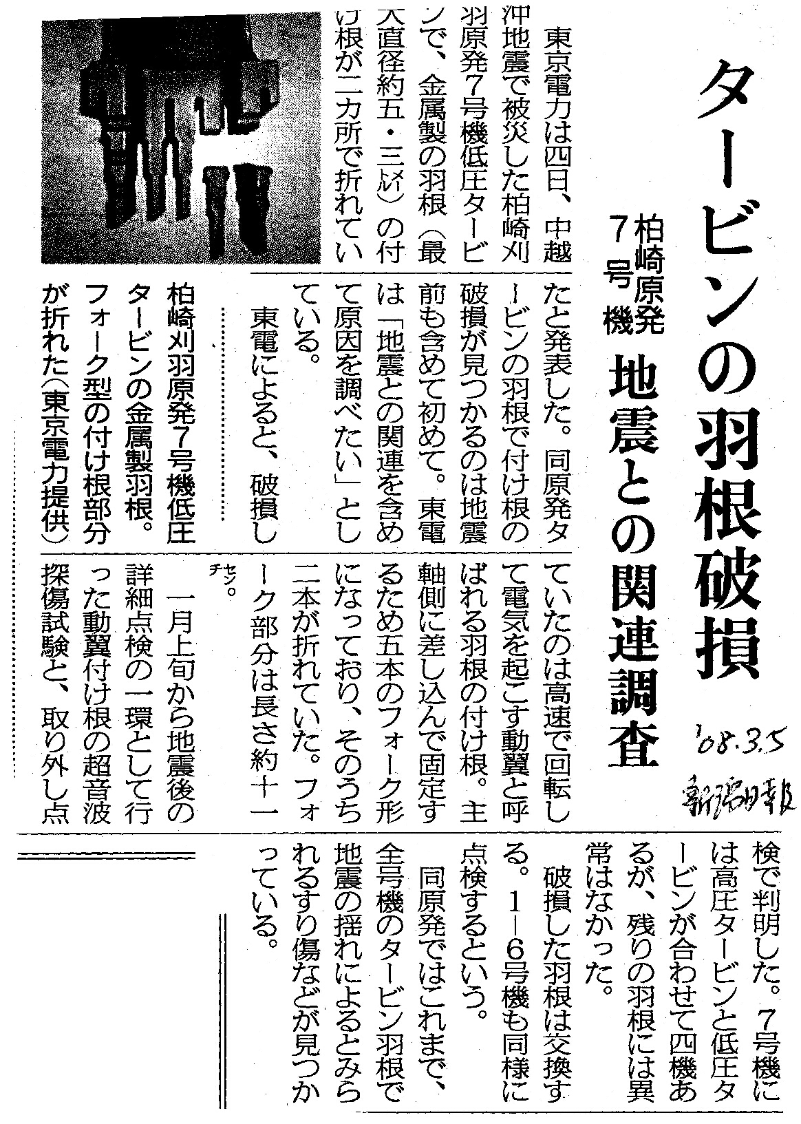 | [2008_03_05_03]タービンの羽根破損 柏崎原発7号機 地震との関連調査(新潟日報2008年3月5日) |