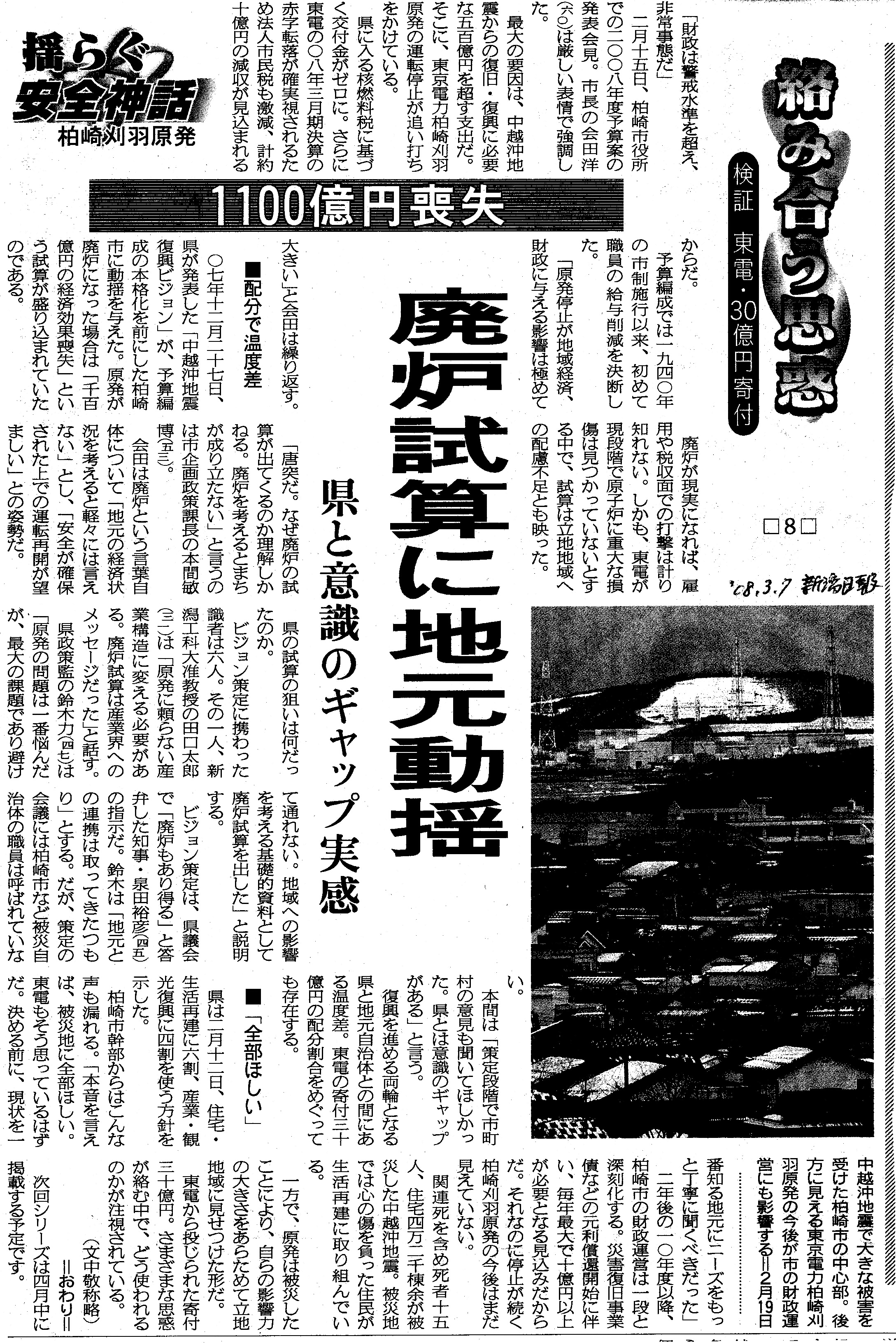 [2008_03_07_01]揺らぐ安全神話 柏崎刈羽原発 絡み合う思惑 検証 東電・30億円寄付 □8□ 1100億円喪失 廃炉試算に地元動揺 県と意識のギャップ実感 配分で温度差 「全部ほしい」(新潟日報2008年3月7日)