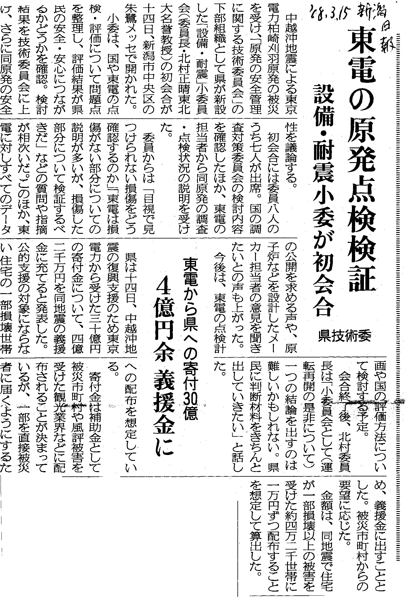 [2008_03_15_01]東電の原発点検検証 設備・耐震小委が初会合 県技術委 東電から県への寄付30億円 4億円余 義援金に(新潟日報2008年3月15日)